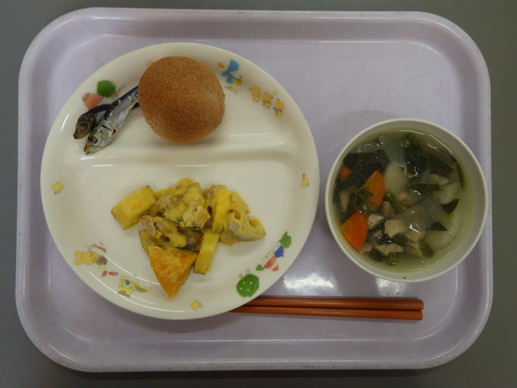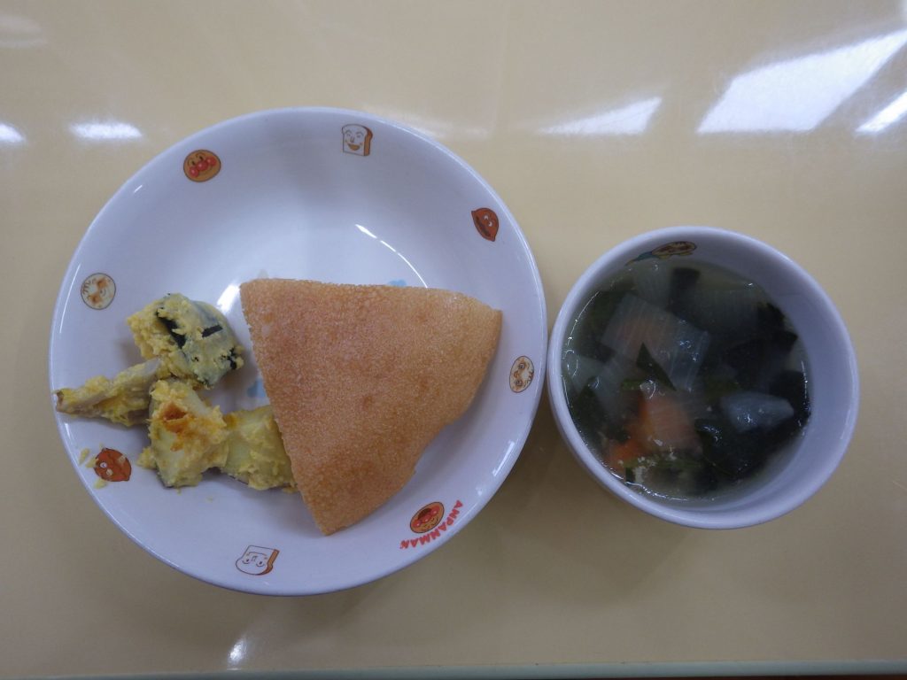 今日の給食 2025.02.03 今日の給食は 上の写真は全粒粉パンです。 この写真は米粉パンです。 パン(もも組、すずらん組米粉パン、ひまわり組、以上児クラスは全粒粉パン) 冬野菜のスープ(鶏肉、玉ねぎ、里いも、ほうれん草、人参) 豆乳サラダ(さつまいも、かぼちゃ、蓮根、鶏肉、豆乳) ひまわり組、以上児クラスは煮干しも食べます。 午前のおやつに全クラス豆乳を飲みました。