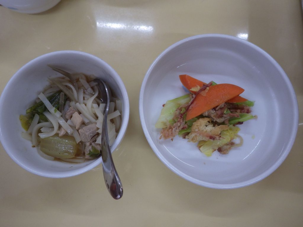 今日の給食 2025.02.14 今日の給食は カレーうどん(すずらん組米粉麺、ひまわり組、以上児クラス小麦粉麺、鶏肉、ごぼう、白菜、ねぎ、しめじ) 煮びたし(キャベツ、小松菜、人参、えのき、油揚げ) ひまわり組、以上児クラスは煮干しも食べます。 午前のおやつに全クラス甘酒を飲みました。 もも組は しょうゆ味のうどんです。(米粉麺)