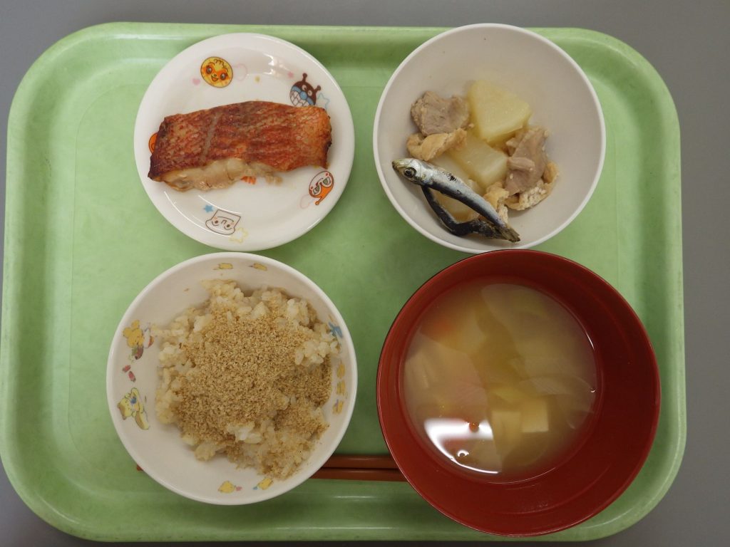 ごはん(もも組、すずらん組白米、ひまわり組五分づき、以上児クラス玄米)