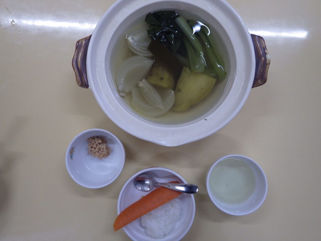 今日の給食 2025.02.26 今日の給食は ごはん(もも組、すずらん組白米、ひまわり組五分づき、以上児クラス玄米)、塩麹納豆、さつまいもの土佐煮(さつまいも、里いも、人参、かつお節) ひまわり組、以上児クラスは煮干しも食べます。 離乳食は 七分粥 ひきわり納豆 土鍋野菜(さつまいも、玉ねぎ、小松菜) 野菜スープ 咀嚼用人参
