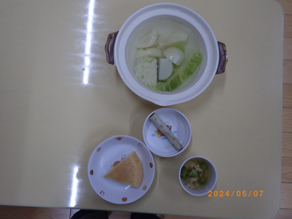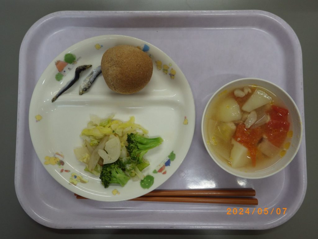 今日の給食 2024.05.07 今日の給食は 全粒粉パン(もも、すずらん組は米粉パン) フレンチ風サラダ(キャベツ、ブロッコリー、かぶ、ごぼう) トマトスープ(鶏肉、トマト、玉ねぎ、じゃがいも) そして煮干し(以上児、2歳児) 離乳食は 土鍋野菜(玉ねぎ、かぶ、キャベツ、昆布出汁) 米粉パン スープ(野菜たっぷり) 咀嚼用ごぼう