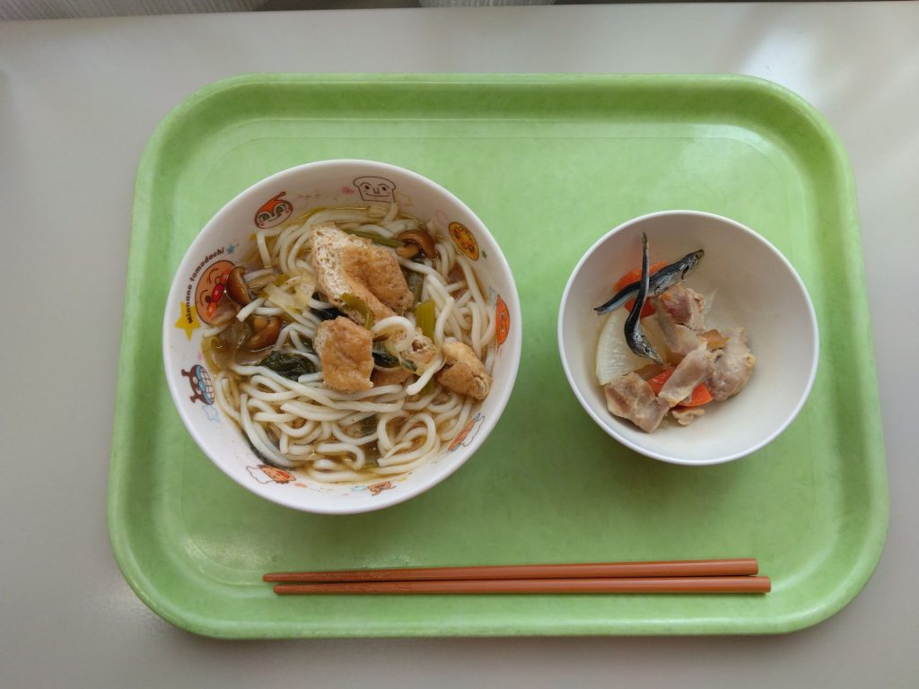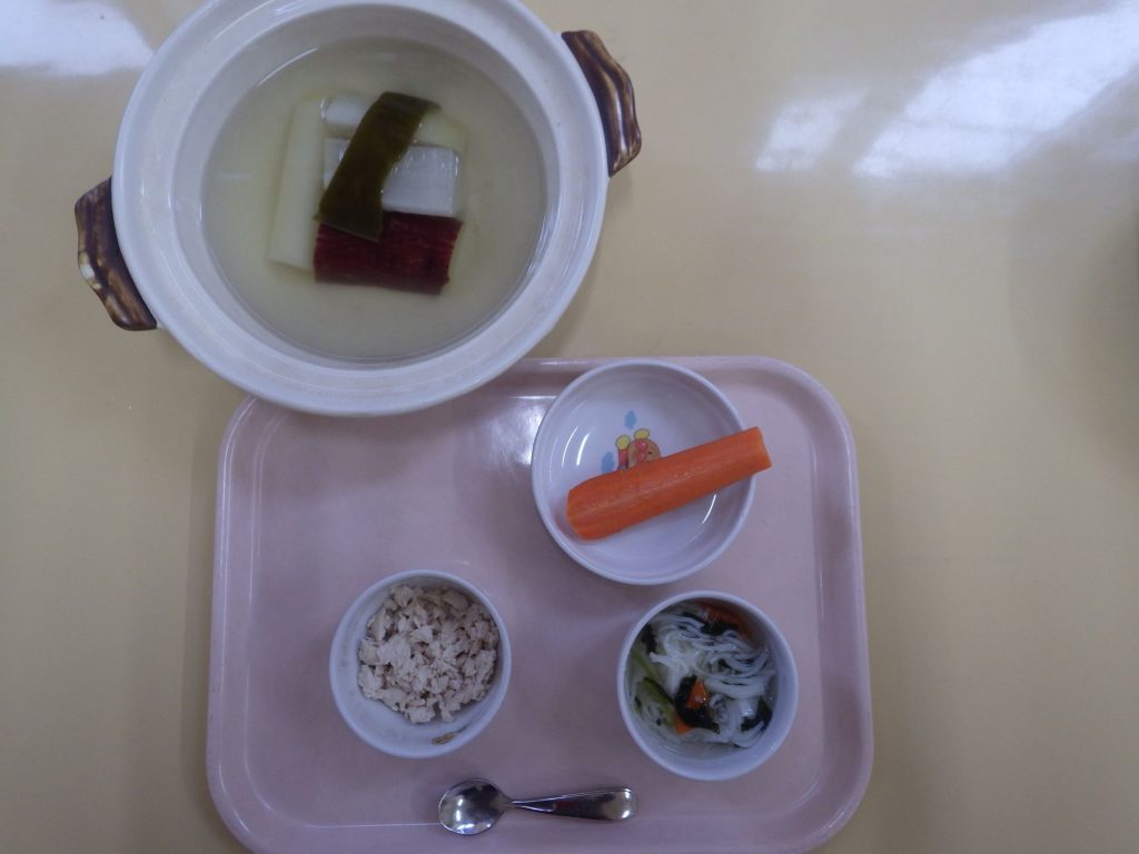 今日の給食 2025.04.04 今日の給食は きつねうどん(もも組、すずらん組米粉麺、ひまわり組、以上児クラスは小麦粉麺、油揚げ、なめこ、長ネギ、ほうれん草) 鶏肉と根菜の煮物(鶏肉、大根、人参) ひまわり組、以上児クラスは午前中、甘酒のあやつを飲みました。 離乳食は 米粉麺 スープ(ほうれん草、人参、鶏肉ささみ) 土鍋野菜(大根、さつまいも、長ネギ)