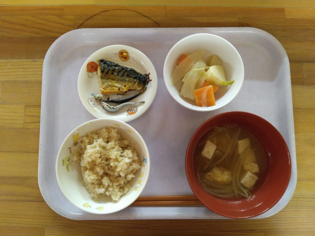 今日の給食 2025.04.08 今日の給食は ごはん(すずらん組白米、ひまわり組五分づき、以上児クラス玄米) 味噌汁(豆腐、もやし、ごぼう、油揚げ) 鯖塩焼き じゃがいもの煮物(じゃがいも、玉ねぎ、油揚げ) ひまわり組、以上児クラスは煮干しも食べます。 ※離乳食はありませんでした。
