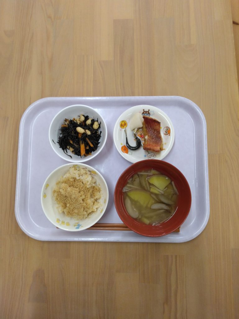 今日の給食 2025.04.17 今日の給食は ごはん(すずらん組白米、ひまわり組五分づき、以上児クラス) 味噌汁(さつまいも、ごぼう、えのき) 赤魚醤油焼き ひじき煮(ひじき、大豆、人参) ひまわり組、以上児クラスは煮干しも食べます。 今日の離乳食はありません。
