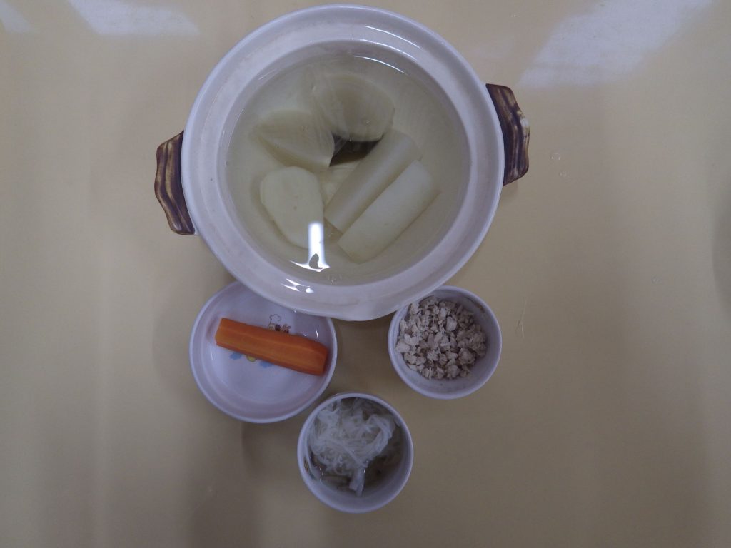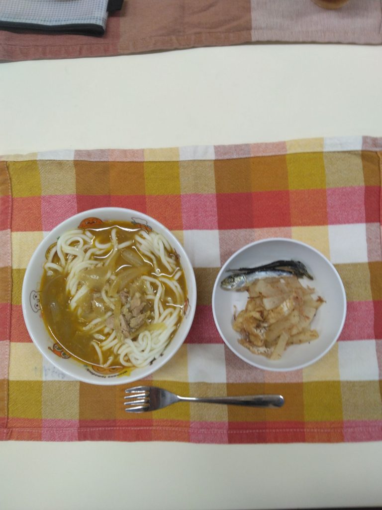 今日の給食 2025.04.18 今日の給食は カレー鶏だしうどん(鶏肉、じゃがいも、玉ねぎ、しめじ、もも組、すずらん組米粉、ひまわり組、以上児クラス小麦粉麺) おかか和え(大根、油揚げ、鰹節) ひまわり組、以上児クラスは煮干しも食べます。 午前のおやつに甘酒を飲みました。 離乳食は 米粉麺 スープ(ごぼう、しめじ) 鶏ささみ 土鍋野菜(大根、じゃがいも、玉ねぎ) 咀嚼用人参