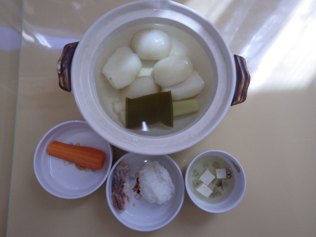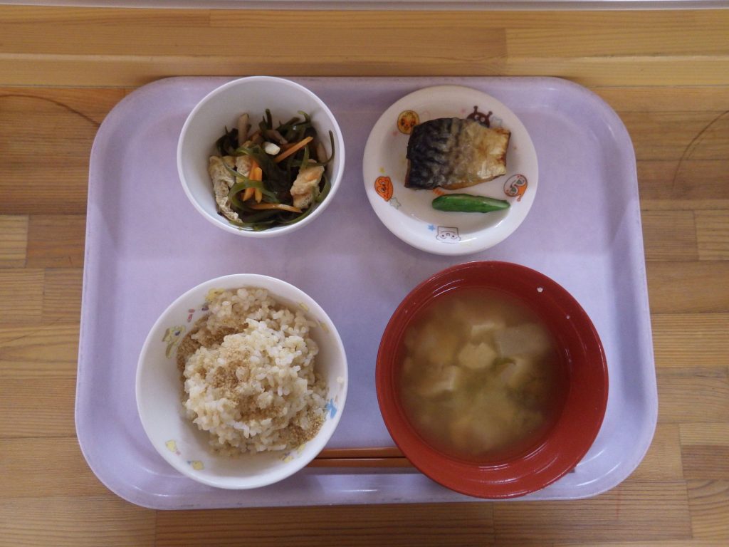 今日の給食 2025.04.22 今日の給食は ごはん(もも組、すずらん組白米、ひまわり組五分づき、以上児クラス玄米) 味噌汁(豆腐、かぶ、長ねぎ) 鯖塩焼き すき昆布煮(すき昆布、人参、しめじ、油揚げ) ひまわり組、以上児クラスは煮干しも食べます。 離乳食は 白米おかゆ スープ(豆腐、しめじ) 焼き赤魚 土鍋野菜(さつまいも、長ねぎ、かぶ) 咀嚼用人参