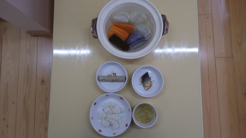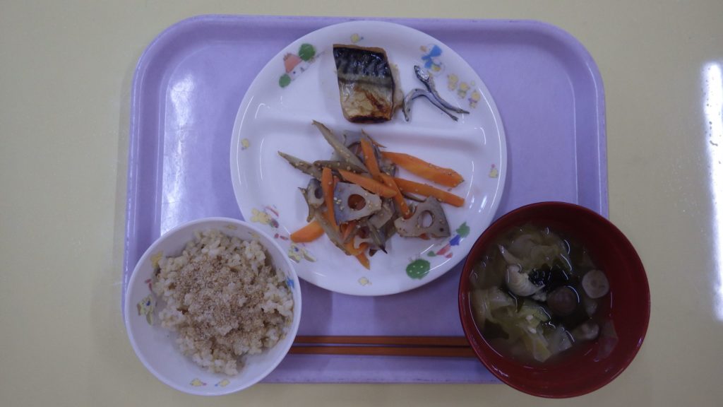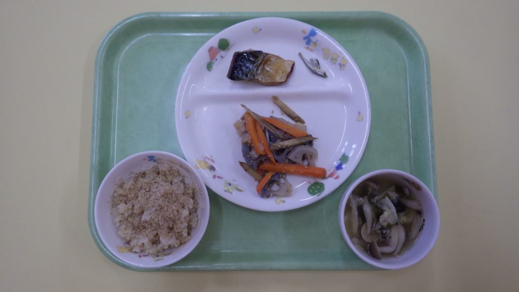 今日の給食 2024.05.09 今日の給食 玄米ごはん(以上児) ひまわり組(五分づきごはん) もも組、すずらん組(白米) みそ汁(具たくさん) 鯖の塩焼き きんぴら炒め ひまわり組、以上児は煮干し 離乳食は 白米 みそ汁 土鍋野菜 焼き魚(鯖、赤魚) 咀嚼用ごぼう