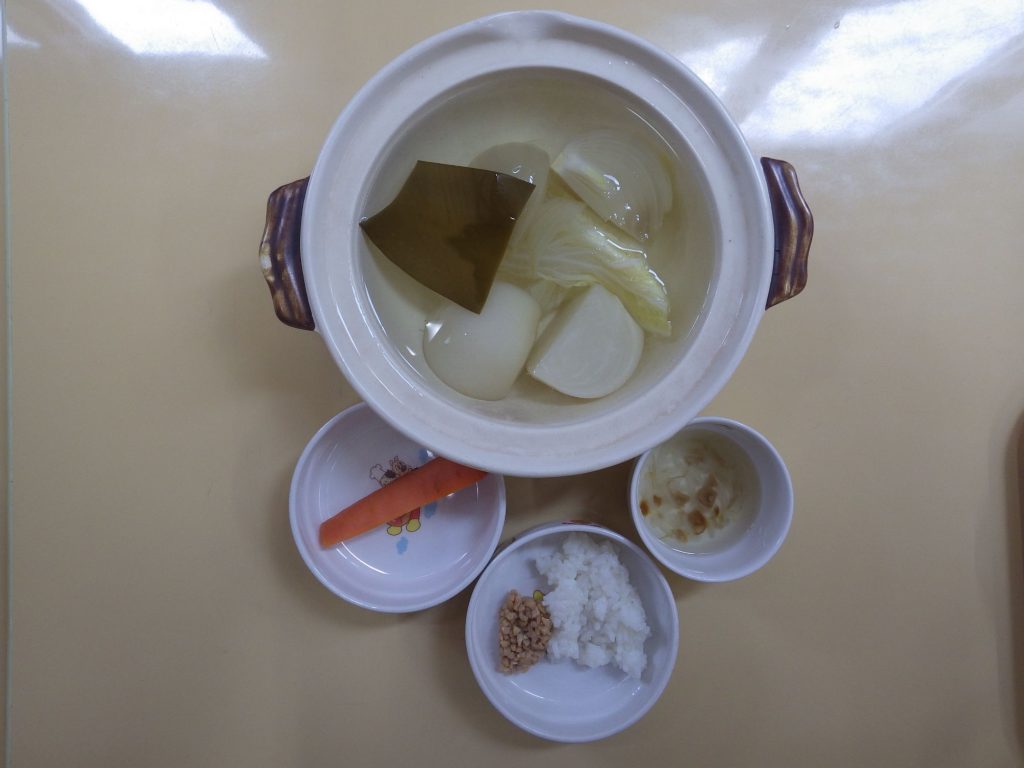 ごはん(もも組、すずらん組白米、ひまわり組五分づき、以上児クラス玄米)