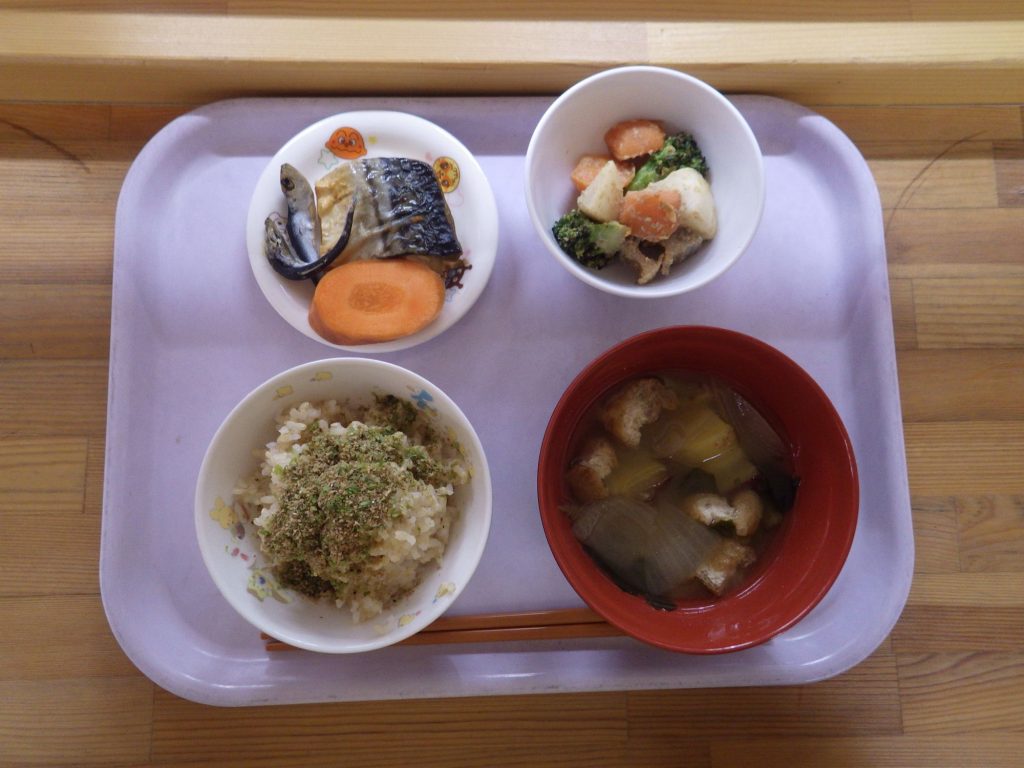 もも組以外のクラスはごはんにすり胡麻と青海苔、魚粉を混ぜたふりかけをかけてます。