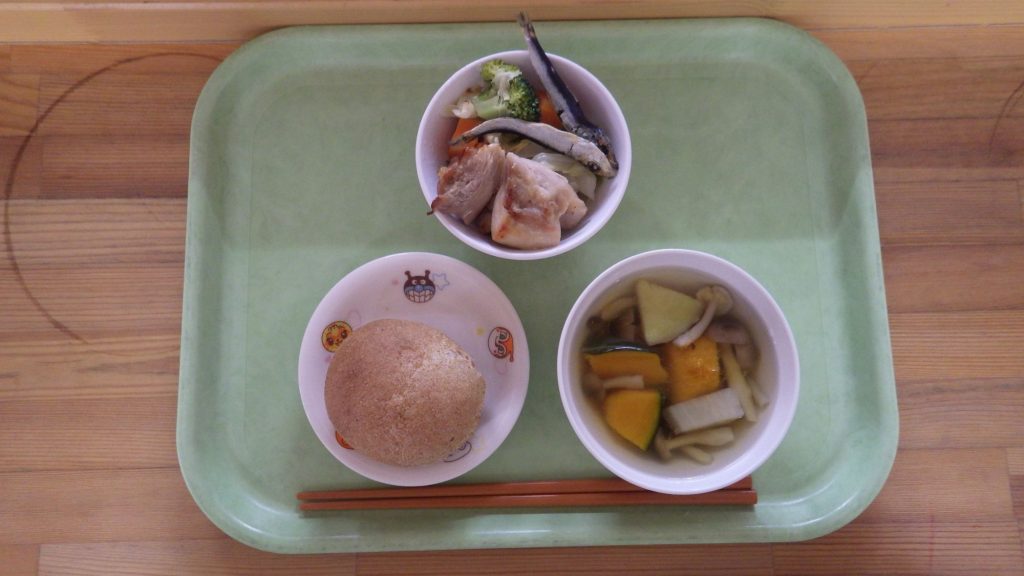 今日の給食 2025.05.12 今日の給食は パン(すずらん組米粉パン、ひまわり組、以上児クラス全粒粉パン) スープ(さつまいも、かぼちゃ、 しめじ) 鶏塩こうじ焼き サラダ(キャベツ、ブロッコリー、玉ねぎ、人参) ひまわり組、以上児クラスは煮干しも食べます。 午前のおやつにもも組以外のクラスは豆乳を飲みました。 離乳食は 白米の軟飯 スープ(かぼちゃ、人参) 鶏ささみ 土鍋野菜(さつまいも、玉ねぎ、蓮根) 咀嚼用人参
