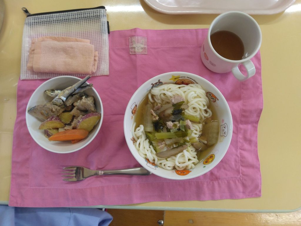 今日の給食 2025.05.23 今日の給食は けんちんうどん(鶏肉、大根、ごぼう、人参、わかめ) すずらん組米粉麺、ひまわり組、以上児クラス小麦粉麺 ごま和え(さつまいも、蓮根、人参、鶏肉) 以上児クラスは人参のぬか漬けも食べます。 ひまわり組、以上児クラスは煮干しも食べます。 今日の離乳食はありません。
