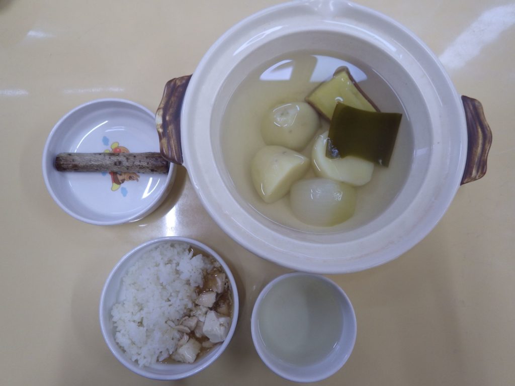 今日の給食 2025.06.11 今日の給食は ごはん(もも組、すずらん組白米、ひまわり組五分づき、以上児クラス玄米) お豆腐丼(豆腐、玉ねぎ、鶏肉、えのき) 味噌汁(さつまいも、ごぼう、油揚げ) 以上児クラスはきゅうりのぬか漬けも食べます。 ひまわり組、以上児クラスは煮干しも食べます。 今日の離乳食は ごはん あんかけ(豆腐、ごぼう、鶏ささみ) 土鍋野菜(さつまいも、玉ねぎ、じゃがいも) 咀嚼用ごぼう
