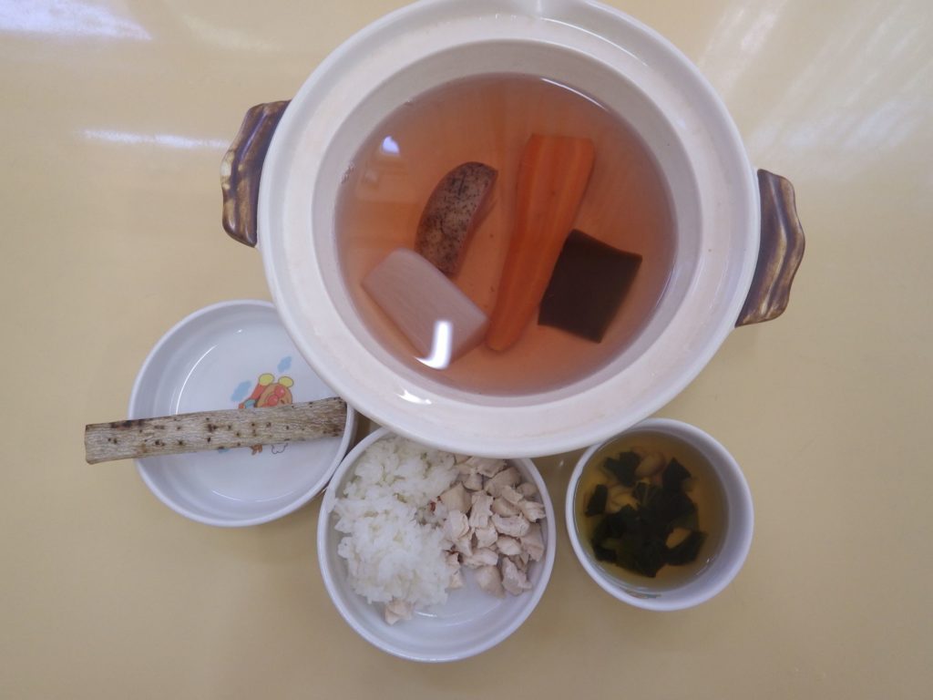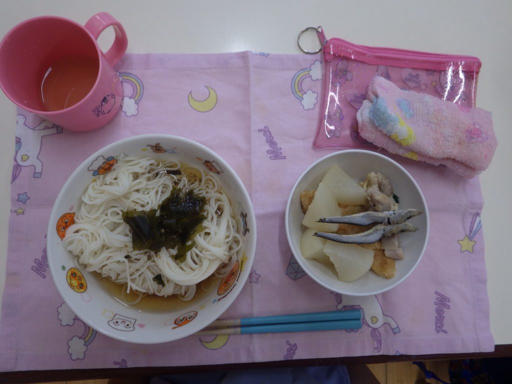 今日の給食 2025.06.13 今日の給食は そうめん(すずらん組米粉麺、ひまわり組、以上児クラス小麦粉麺) 根菜とお揚げの煮物(大根、人参小松菜、しめじ、鶏肉、油揚げ) ひまわり組、以上児クラスは煮干しも食べます。 もも組以外のクラスは午前のおやつに豆乳を飲みました。 今日の離乳食は 白米ごはん 汁物(小松菜、しめじ) 鶏ささみ 土鍋野菜(大根、人参、蓮根) 咀嚼用ごぼう