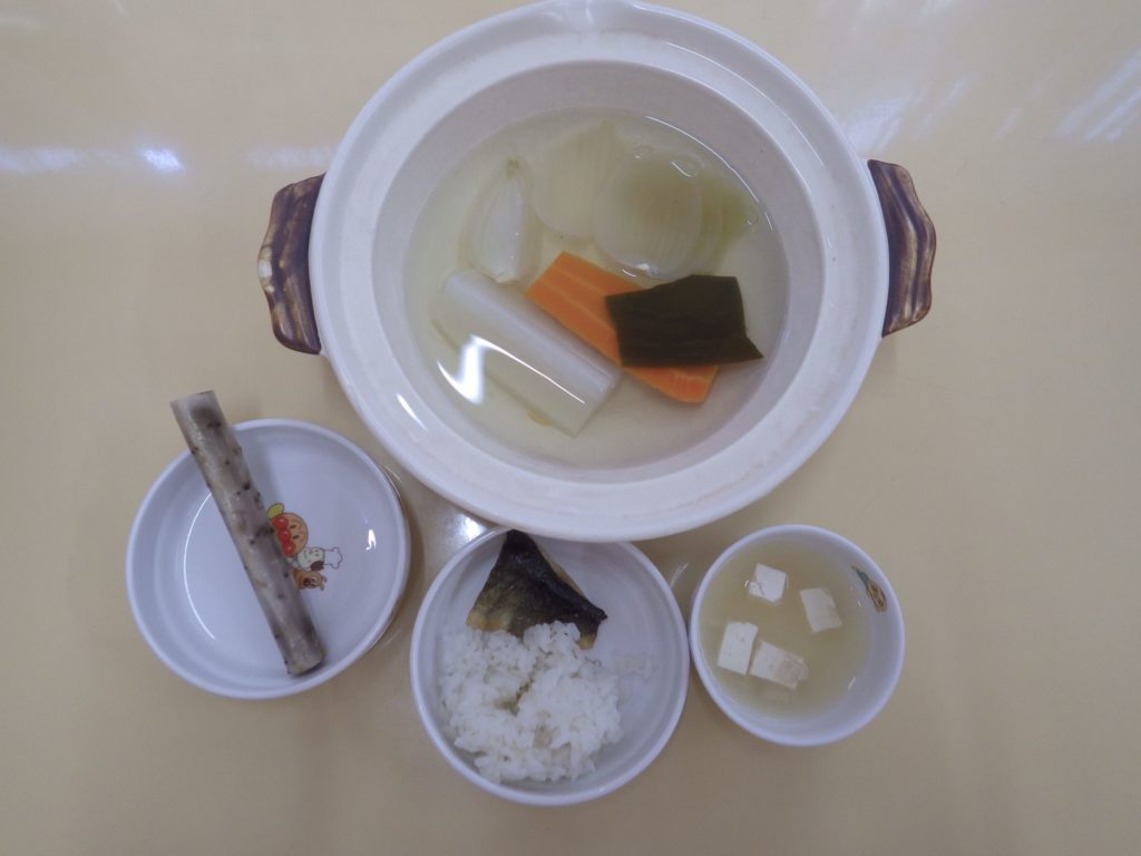 今日の給食 2025.06.20 今日はおにぎりデーでした。食べ物に感謝して大切に食べる事をねらいとしています。 味噌汁(豆腐、玉ねぎ、人参、えのき、大根) 各ご家庭から塩おにぎりを持参 今日の離乳食は 白米ごはん 汁物(豆腐、えのき) ほっけ 土鍋野菜(大根、玉ねぎ、人参) 咀嚼用ごぼう