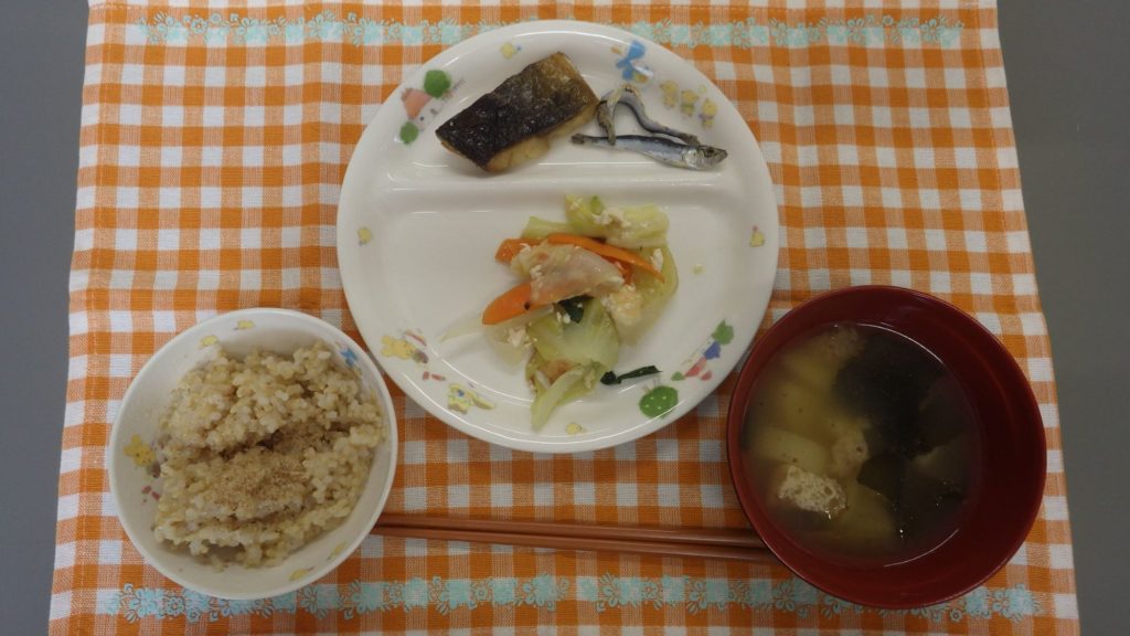 今日の給食 2024.05.16 玄米ごはん(以上児) もも組、すずらん組白米 ひまわり組五分づき みそ汁(具たくさん) ほっけの塩焼き 豆腐炒め 煮干し(ひまわり組、以上児) 離乳食 白米 みそ汁 土鍋野菜(人参、玉ねぎ、キャベツ) ほっけ焼き 咀嚼用ごぼう