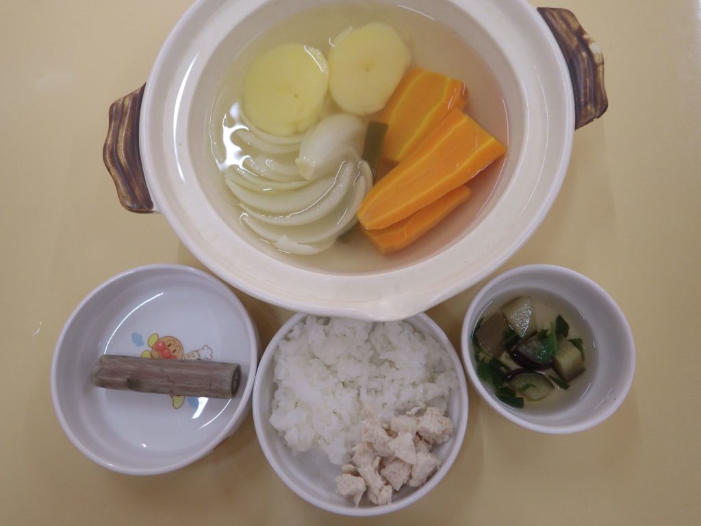 今日の給食 2025.08.04 今日の給食は パン(すずらん組米粉パン、ひまわり組、以上児クラス全粒粉パン) スープ(じゃがいも、玉ねぎ、なす、ほうれん草) サラダ(鶏肉、きゅうり、トマト、もやし) ひまわり組、以上児クラスは煮干しも食べます。 もも組以外、午前のおやつに豆乳も飲みました。 今日の離乳食は 白米ごはん スープ(ほうれん草、なす) 鶏ささみ 土鍋野菜(じゃがいも、玉ねぎ、人参) 咀嚼用ごぼう
