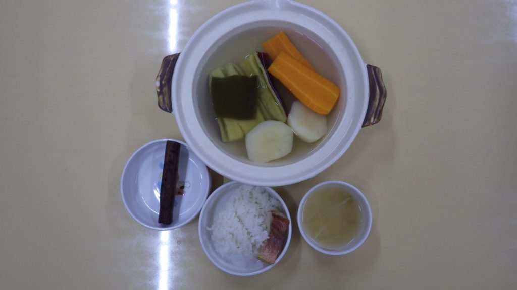 今日の給食 2025.09.17 今日の給食は ごはん(もも組、すずらん組白米、ひまわり組五分づき、以上児クラス玄米) ふりかけ(魚粉、青海苔) 味噌汁(チンゲン菜、もやし、えのき、油揚げ) 赤魚塩焼き おかか和え(さつまいも、じゃがいも、人参、かぼちゃ) 以上児クラスはきゅうりのぬか漬けも食べました。 ひまわり組、以上児クラスは煮干しも食べます。 離乳食は 白米ごはん 味噌汁(もやし、えのき) 赤魚塩焼き 土鍋野菜(さつまいも、じゃがいも、人参) 咀嚼用ごぼう