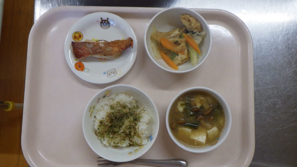 今日の給食 2025.10.03 今日の給食は ごはん(もも組、すずらん組白米、ひまわり組五分づき) 青海苔、魚粉のふりかけ 赤魚醤油焼き 煮びたし(キャベツ、小松菜、人参、油揚げ) ひまわり組は煮干しも食べます。 離乳食は 白米ごはん 味噌汁(豆腐、なめこ) 赤魚塩焼き 土鍋野菜(人参、キャベツ、長ねぎ) 咀嚼用ごぼう 以上児クラスは弁当日でした。