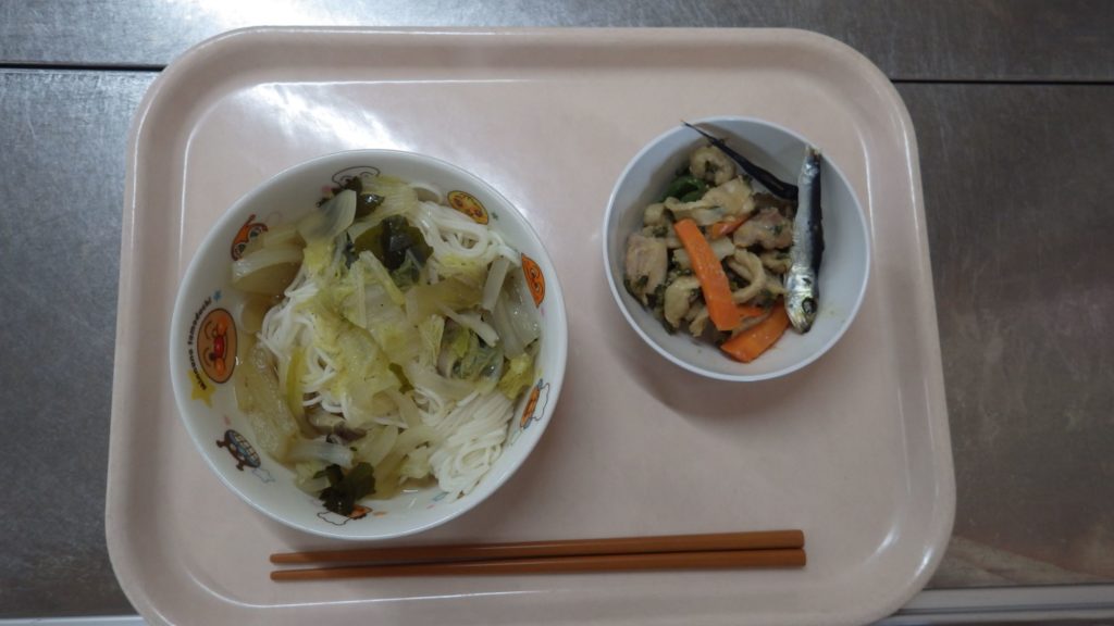 今日の給食 2025.10.09 今日の給食は にゅうめん(白菜、椎茸、玉ねぎ、わかめ、もも組、すずらん組米粉麺、ひまわり組、以上児クラス小麦粉麺) 炒めもの(鶏肉、じゅがいも、人参、ピーマン、切り干し大根、紫蘇の実) ひまわり組、以上児クラスは煮干しも食べます。 全クラス、午前のおやつに甘酒を飲みました。
