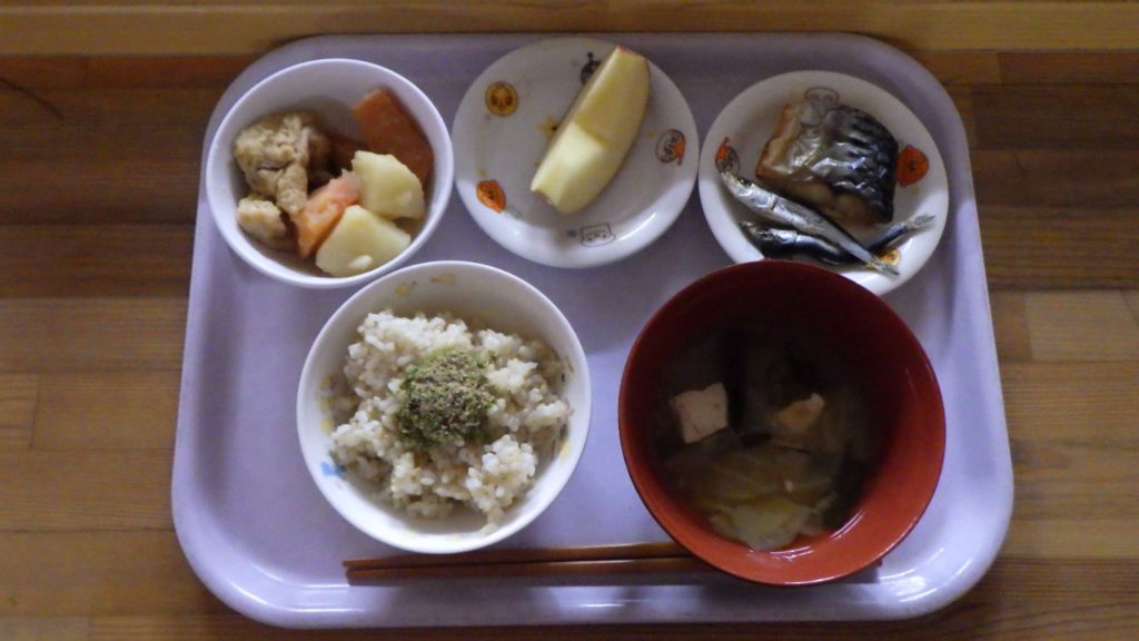 ごはん(もも組、すずらん組白米、ひまわり組五分づき、以上児玄米)