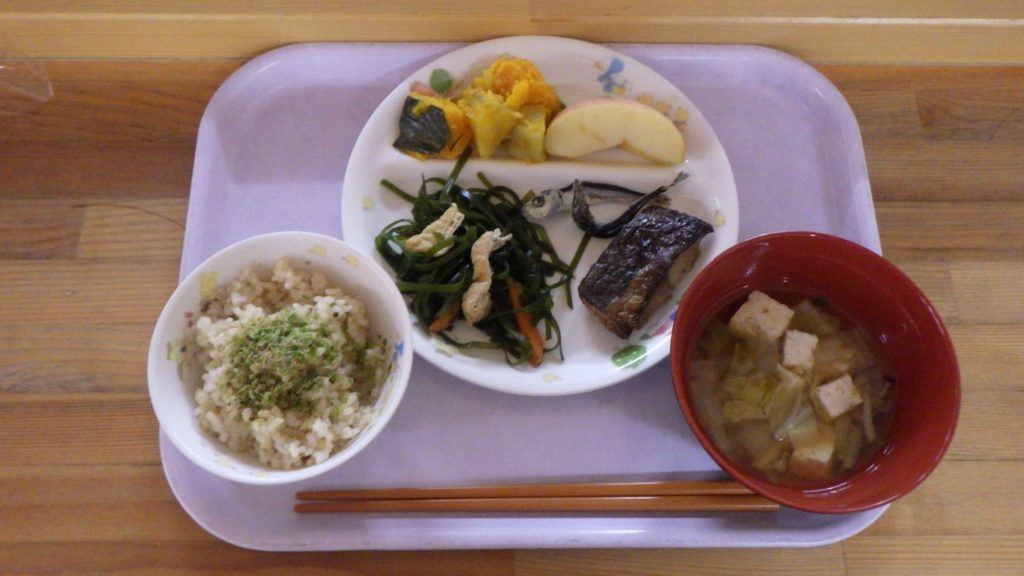 今日の給食 2025.12.09 今日の給食は ごはん(もも組、すずらん組白米、ひまわり組五分づき、以上児クラス玄米) 魚粉ふりかけ 味噌汁 ほっけ醤油焼き すき昆布煮 オーブン焼き デザート(りんご) ひまわり組、以上児クラス煮干し