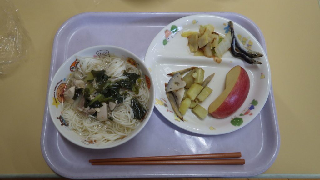 今日の給食 2025.12.11 今日の給食は 鶏塩そうめん(もも組、すずらん組米粉麺、ひまわり組、以上児クラス小麦粉麺) おかかえ和え きんぴら炒め デザート(りんご) ひまわり組、以上児クラス煮干し