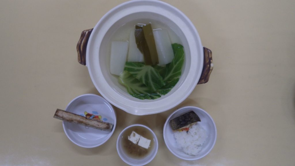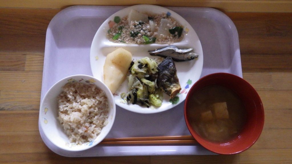 今日の給食 2025.12.24 今日の給食は ごはん(もも組、すずらん組白米、ひまわり組五分づき、以上児クラス玄米) 以上児は梅干しごはん(年長さんが作った梅干し) 豆腐と白菜の味噌汁 ほっけの塩焼き 鶏ひき肉のそぼろ煮 キャベツともやしの海苔和え デザート(梨) ひまわり組、以上児クラス煮干し 離乳食は ごはん(白米) 豆腐となめこの味噌汁 ほっけ 土鍋野菜(大根、キャベツ) 咀嚼用ごぼう