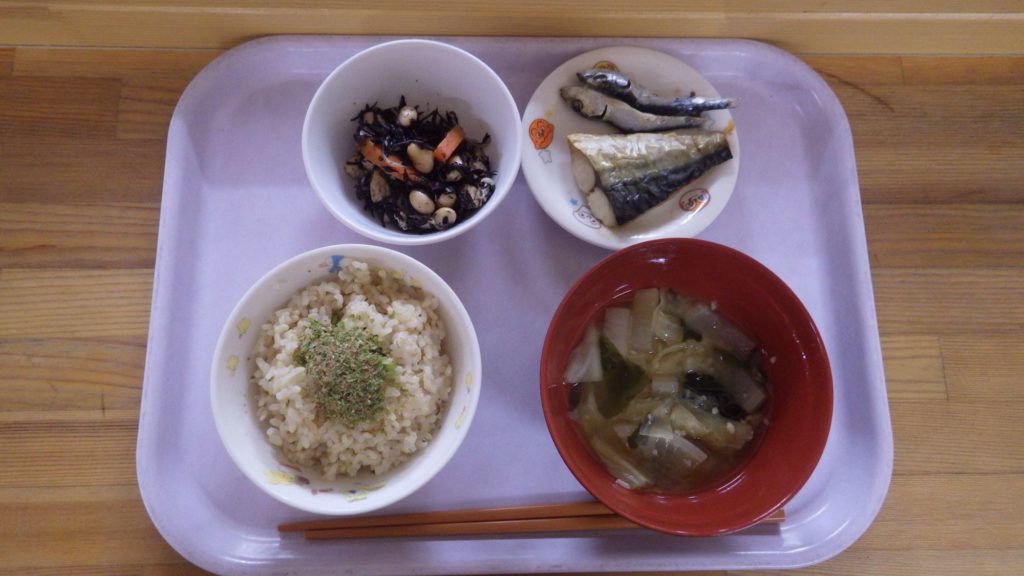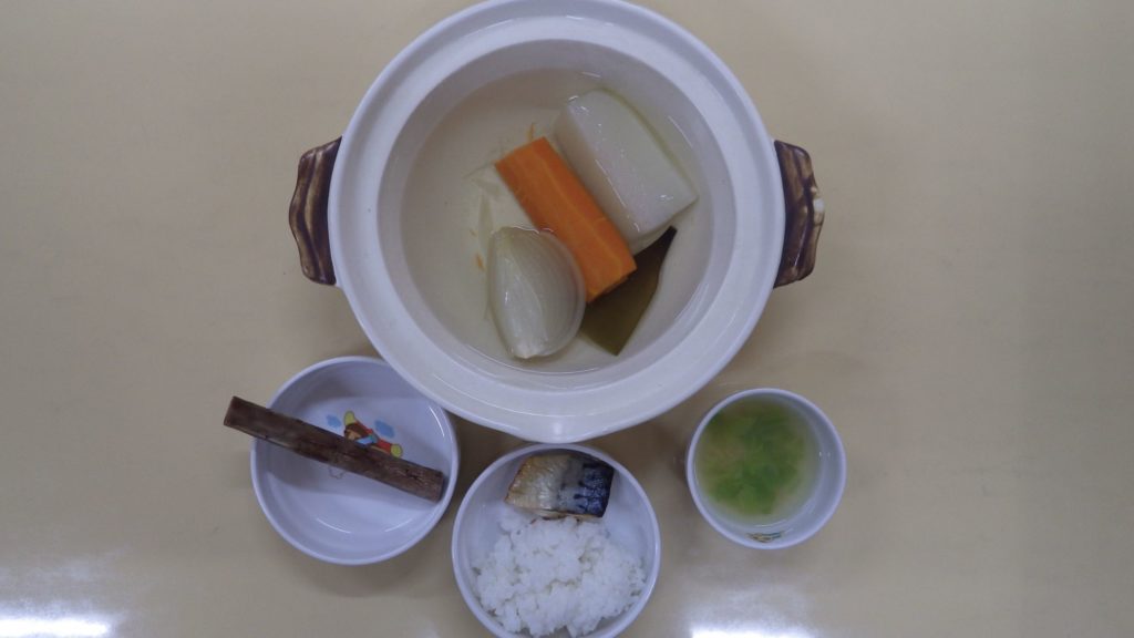 今日の給食 2025.12.25 今日の給食は ごはん(もも組、すずらん組白米、ひまわり組五分づき、以上児クラス玄米) 魚粉ふりかけ 大根、キャベツの味噌汁 鯖塩焼き ひじき煮 ひまわり組、以上児クラス煮干し 午後のおやつは味噌おにぎり 離乳食は ごはん(白米) キャベツ、えのきのみそ汁 鯖 土鍋野菜(大根、たまねぎ、人参) 咀嚼用ごぼう