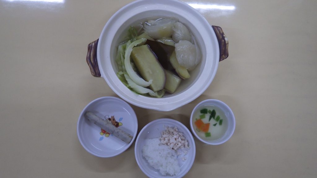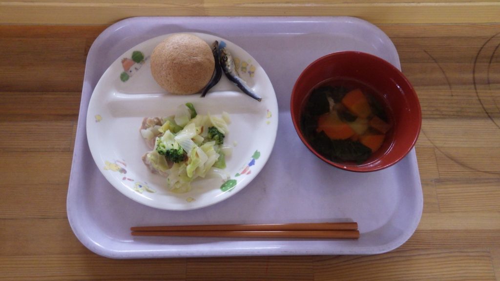 今日の給食 2026.01.19 今日の給食は パン(もも組、すずらん組米粉パン、ひまわり組、以上児クラス全粒粉パン) ほうれん草、トマト、鶏肉のスープ キャベツとブロッコリー、玉ねぎのサラダ 午前のおやつに豆乳 午後のおやつは焼きかぼちゃ 今日の離乳食は 白米ごはん ほうれん草と人参のスープ 鶏ささみ 土鍋野菜(さつまいも、玉ねぎ、キャベツ) 咀嚼用ごぼう