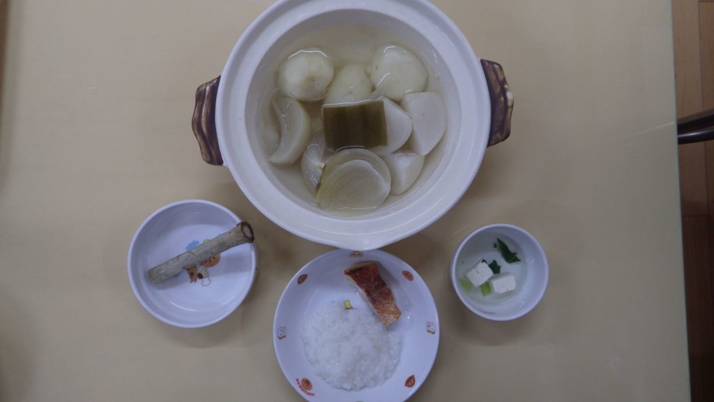 今日の給食 2026.01.27 今日の給食は ごはん(もも組、すずらん組白米、ひまわり組五分づき、以上児クラス玄米) 豆腐と玉ねぎ、小松菜の味噌汁 赤魚醤油焼き 人参と油揚げのすき昆布煮 ひまわり組、以上児クラス煮干し 以上児クラスきゅうりの糠漬け 午後のおやつは焼きおにぎり 今日の離乳食は 白米ごはん 豆腐と小松菜のスープ 焼き赤魚 土鍋野菜(じゃがいも、玉ねぎ、かぶ) 咀嚼用ごぼう