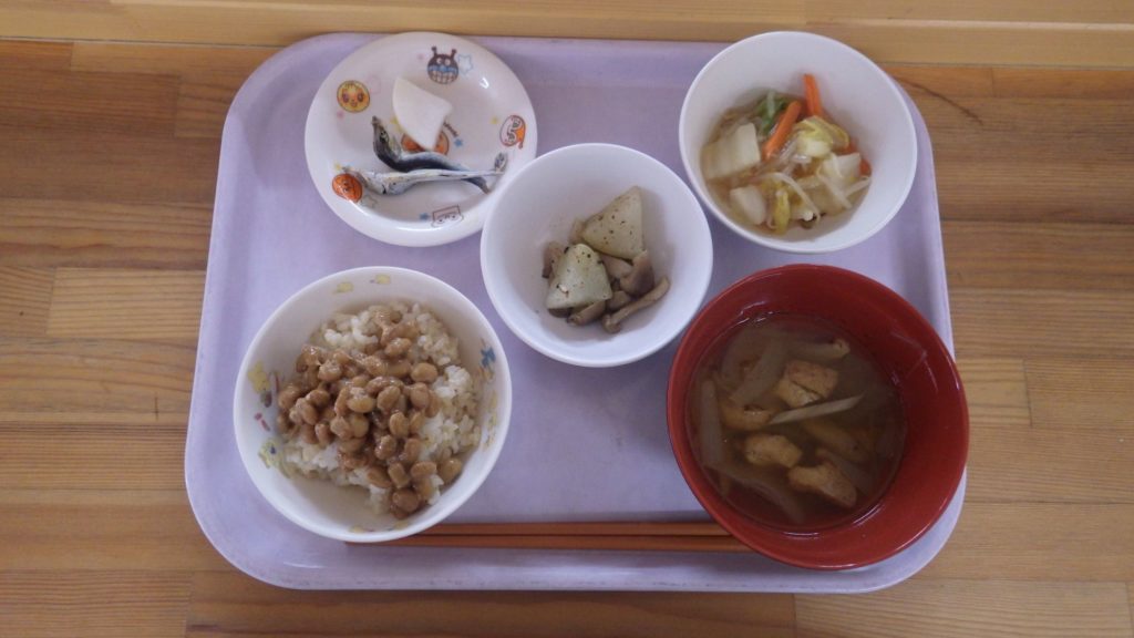 今日の給食 2026.02.04 今日の給食は ごはん(もも組、すずらん組白米、ひまわり組五分づき、以上児クラス玄米) 玉ねぎ、ごぼうの味噌汁 納豆 大根、しめじの煮物 白菜のあんかけ 以上児クラスは大根の糠漬け ひまわり組、以上児クラス煮干し午後のおやつは青海苔のおにぎり 離乳食は 白米 人参、もやしの味噌汁 ひきわり納豆 土鍋野菜(大根、玉ねぎ、白菜) 咀嚼用ごぼう