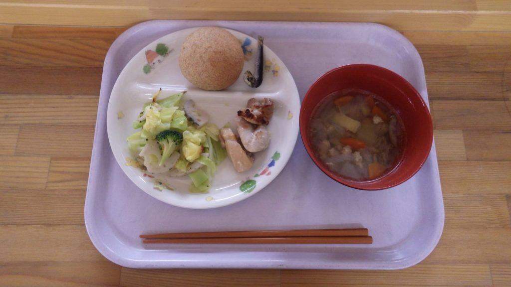 今日の給食 2026.02.16 今日の給食は パン(もも組、すずらん組米粉パン、ひまわり組、以上児クラス全粒粉パン) さつまいもと人参のスープ 鶏もも肉漬け焼き キャベツと蓮根のサラダ ひまわり組、以上児クラスは煮干し 午後のおやつは青海苔おにぎり 今日の離乳食は 白米ごはん かぼちゃと人参のスープ 鶏ささみ肉 土鍋野菜(さつまいも、玉ねぎ、キャベツ) 咀嚼用ごぼう 午後のおやつは白米おにぎり