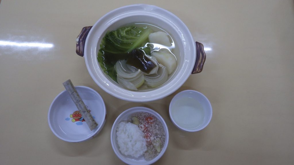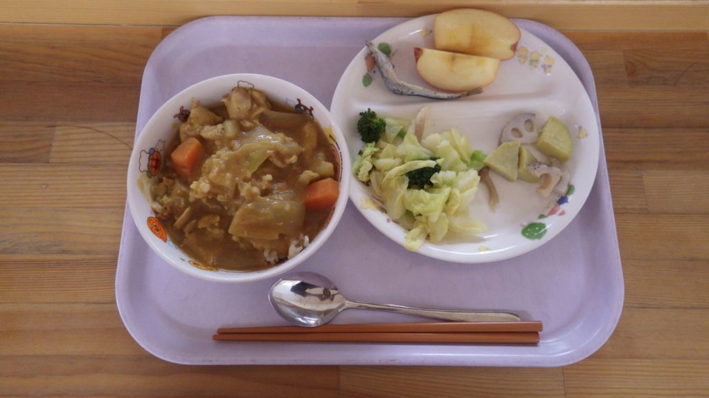 今日の給食 2026.02.19 今日の給食は カレーライス(もも組、すずらん組白米、ひまわり組五分づき、以上児クラス玄米) さつまいもと蓮根のオーブン焼き キャベツとブロッコリーのサラダ ひまわり組、以上児クラスは煮干し 誕生会おやつはカップケーキ 今日の離乳食は 白米ごはん さつまいもと人参のあんかけ 土鍋野菜(じゃがいも、玉ねぎ、キャベツ) 咀嚼用ごぼう 誕生会のおやつはミルクケーキ