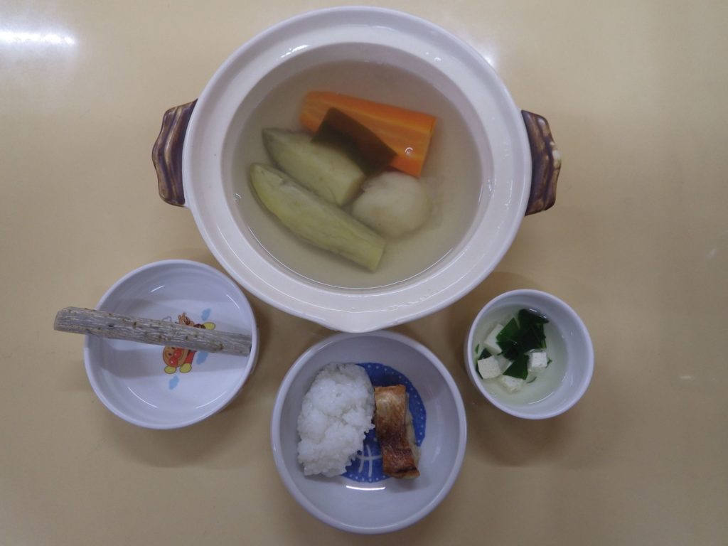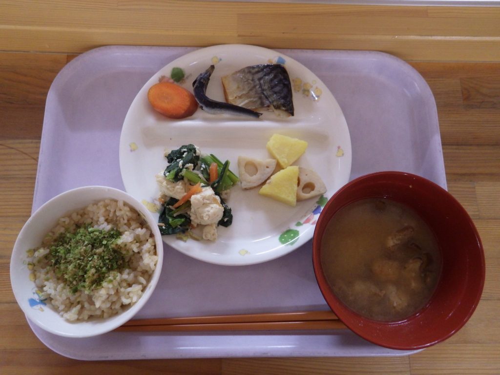 今日の給食 2026.03.27 今日の給食は ごはん(もも組、すずらん組白米、ひまわり組五分づき、以上児クラス玄米)魚粉のふりかけ じゃがいも、なめこの味噌汁 豆腐、小松菜の白和え 鯖塩焼き さつまいも、蓮根の炒め物 以上児クラスは人参の糠漬け 離乳食は 白米粥 豆腐と小松菜のスープ 赤魚焼き 土鍋野菜(さつまいも、じゃがいも、人参) 咀嚼用ごぼう 今日のおにぎりは魚粉入りおにぎり