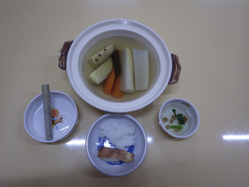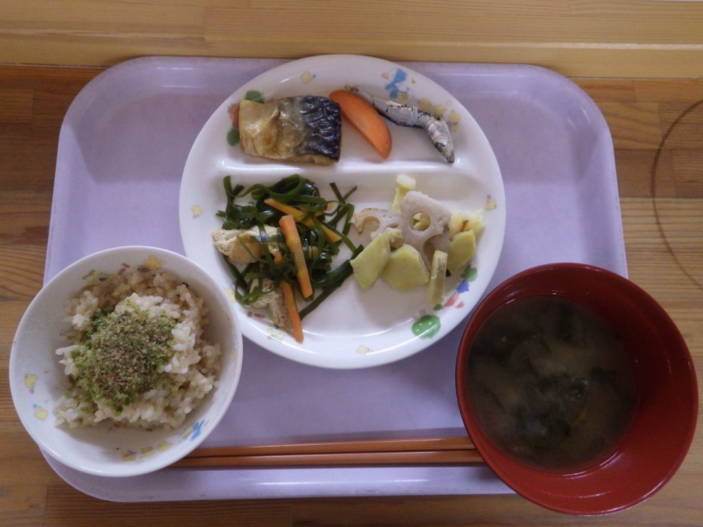 今日の給食 2026.04.02 今日の給食は ごはん(すずらん組、ひまわり組五分づき、以上児クラス玄米) 大根とほうれん草、なめこの味噌汁 鯖塩焼き 油揚げと人参のすき昆布煮 じゃがいもとさつまいも、蓮根の煮物 以上児クラスは人参の糠漬け ひまわり組、以上児クラスは煮干し 午後のおやつはわかめおにぎり 今日の離乳食は 白米粥 ほうれん草となめこのスープ 土鍋野菜(大根、さつまいも、人参) 咀嚼用ごぼう