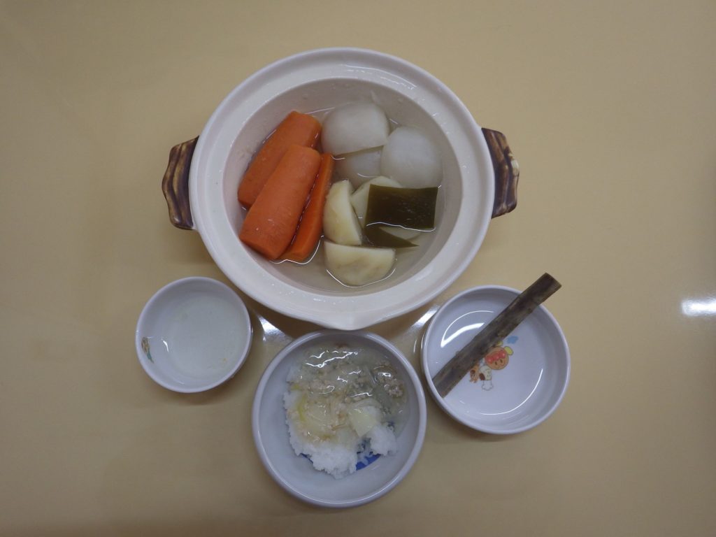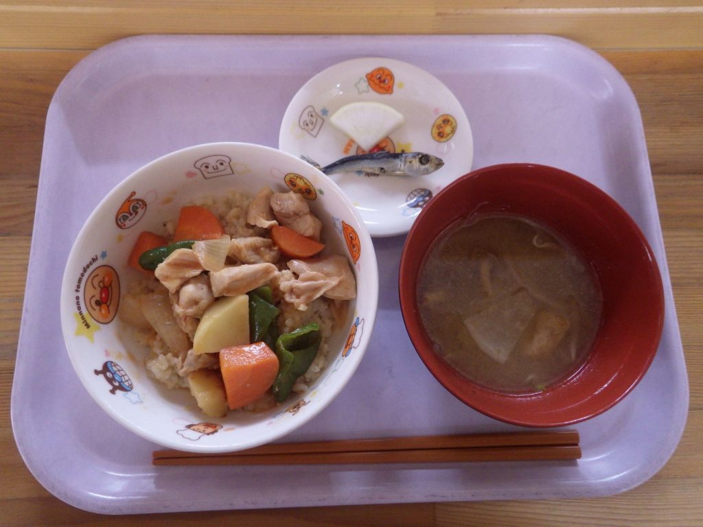 今日の給食 2026.04.08 今日の給食は ごはん(すずらん組、ひまわり組五分づき、以上児クラス玄米) 人参と玉ねぎ、ピーマンの酢鶏丼 もやしとなめこ、油揚げの味噌汁 以上児クラスは大根の糠漬け ひまわり組、以上児クラスは煮干し 午後のおやつはおかかおにぎり 今日の離乳食は 白米粥 鶏肉と玉ねぎ、もやしのあんかけ丼 土鍋野菜(かぶ、じゃがいも、人参) 咀嚼用ごぼう 午後のおやつは軟飯おにぎり