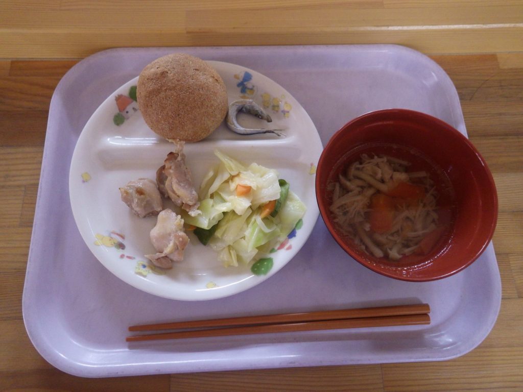 今日の給食 2026.04.13 今日の給食は パン(全粒粉パン) 鶏肉、しめじのスープ 鶏肉漬け焼き キャベツ、玉ねぎのサラダ ひまわり組、以上児クラスは煮干し 午前のおやつに豆乳を飲みました 午後のおやつは魚粉と青海苔のおにぎり 離乳食は 白米 しめじ、えのきのスープ 鶏肉水煮 土鍋野菜(人参、玉ねぎ、キャベツ) しゃくごぼう