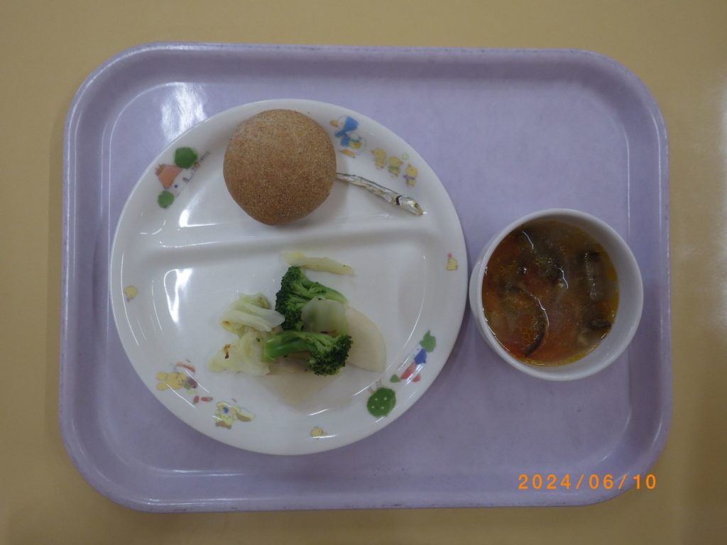 今日の給食 2024.06.10 今日の給食は パン(全粒粉) あっさりサラダ トマトスープ ひまわり組は煮干し もも組、すずらん組の給食は パン(米粉パン) あっさりサラダ トマトスープ 離乳食は パン(米粉パン) 土鍋野菜(キャベツ、人参、カブ) 野菜スープ 咀嚼用ごぼう ※以上児クラスは休園でした。
