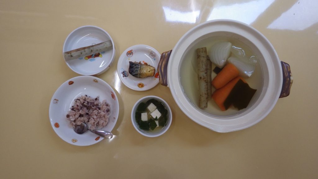 今日の給食 2024.06.12 今日の給食は 小豆ごはん(もも組、すずらん組白米、ひまわり組五分づき、以上児玄米) 味噌汁(豆腐、ほうれん草、油揚げ) さばの醤油焼き 酢の物(わかめ、人参、玉ねぎ、しめじ) ひまわり組、以上児煮干し 小豆ごはん(白米) 味噌汁(豆腐、ほうれん草) さばの塩焼き 土鍋野菜(人参、玉ねぎ、ごぼう) 咀嚼用ごぼう