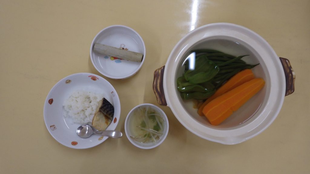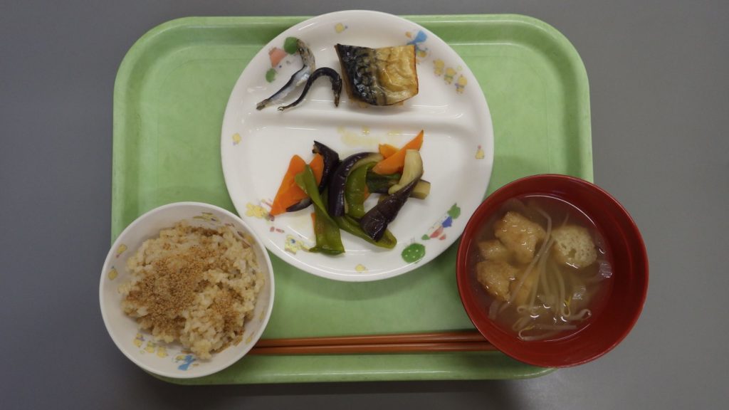 ごはん(もも組、すずらん組白米、ひまわり組五分づき、以上児玄米)