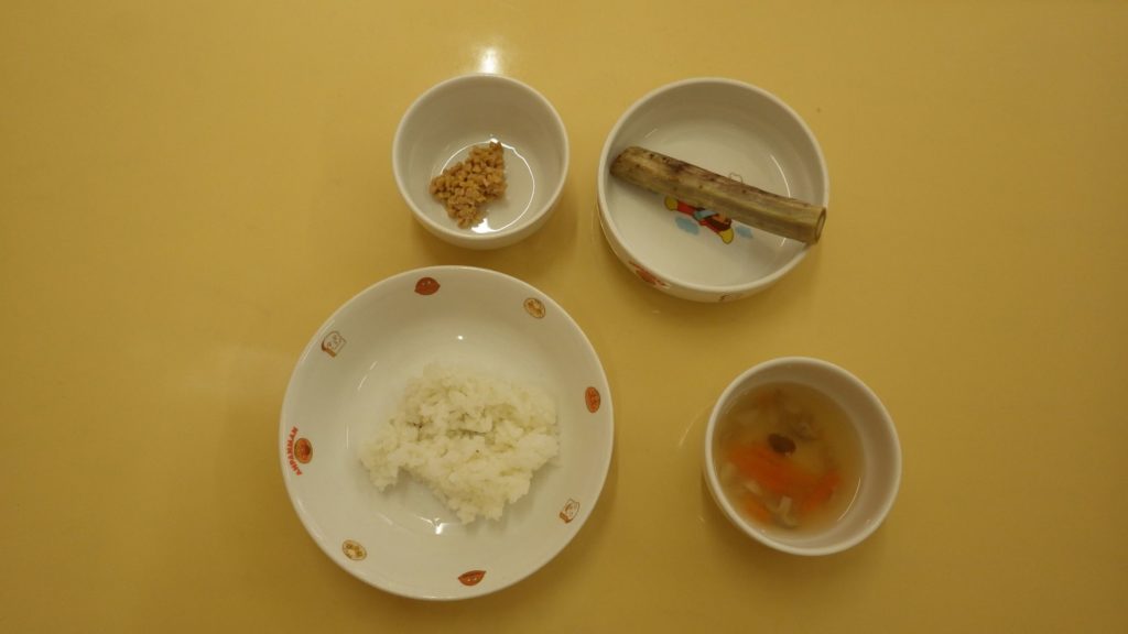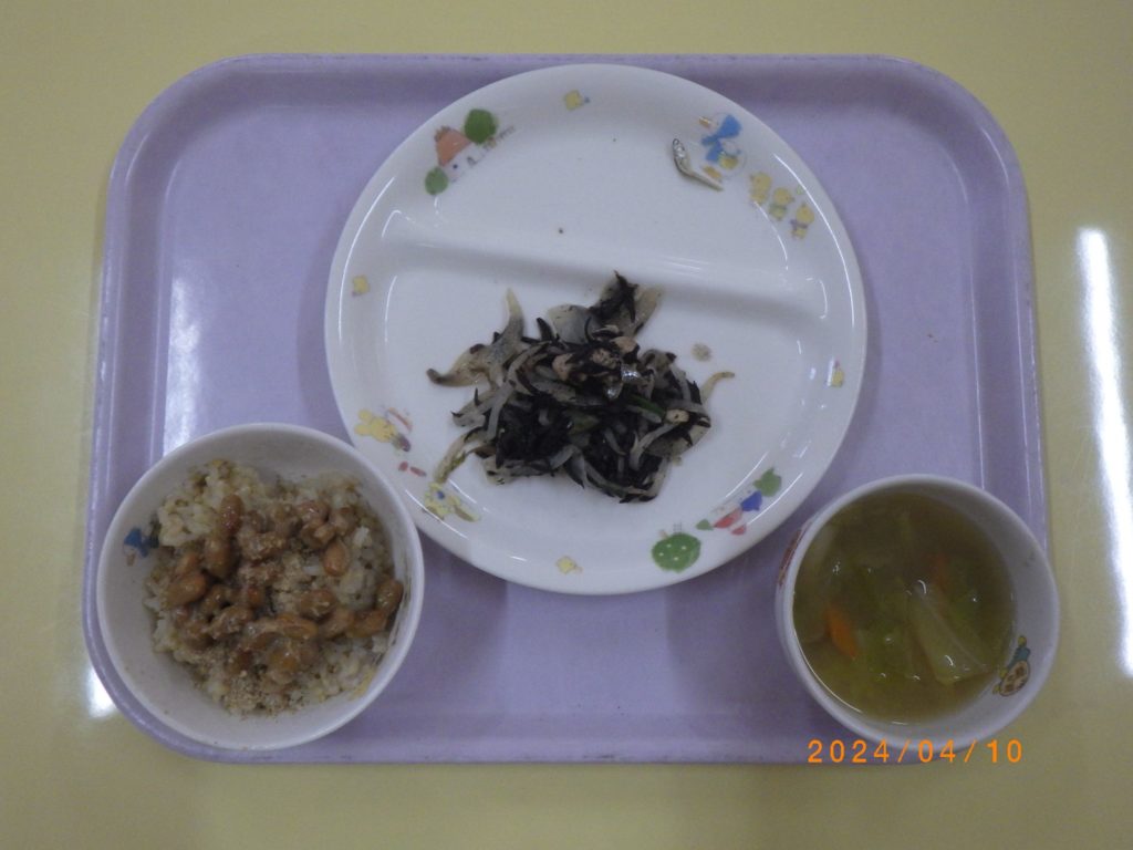 今日の給食 2024.04.10 今日は納豆ごはん。 ひじき炒め… 具たくさんの味噌汁。 そして煮干し!! 納豆は子どもたちの食が進みます。 離乳食のメニューは土鍋野菜、白米、ひきわり納豆!と、具たくさん味噌汁。 もちろん咀嚼用のごぼう!! むしゃむしゃカジカジしてます。