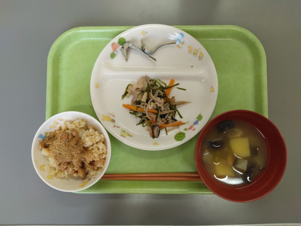 今日の給食 2024.08.07 今日の給食は ごはん(すずらん組白米、ひまわり組五分づき、以上児玄米) 味噌汁(じゃがいも、なす、油揚げ) すきこんぶ炒め物(すきこんぶ、しいたけ、人参、鶏肉、えのき) 味噌納豆 ひまわり組、以上児は煮干しを食べます。