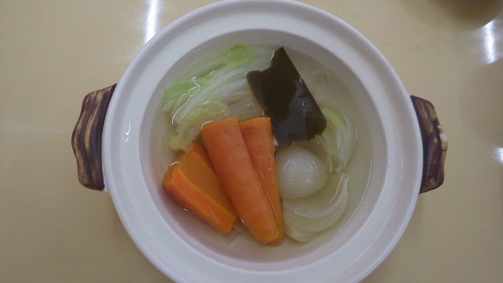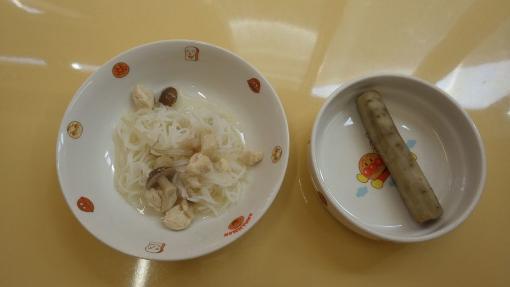 今日の給食 2024.04.12 今日の給食は五目中華そばでした。 鶏肉、玉ねぎ、しめじ、人参、白菜と野菜たっぷりの五目中華です。 副菜は和え物(ほうれん草、もやし、にんじんのいりごまの和え物です) 0歳児クラスは米粉麺と土鍋野菜 そして咀嚼用のごぼうです。