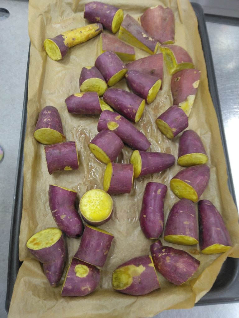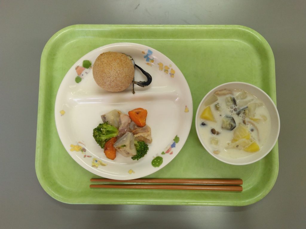今日の給食 2024.08.19 今日の給食は パン(もも組、すずらん組米粉パン、ひまわり組、以上児クラスは全粒粉パン) 豆乳スープ(じゃがいも、玉ねぎ、しめじ) 温サラダ(ブロッコリー、人参、蓮根、鶏肉) 離乳食は 土鍋野菜(蓮根、じゃがいも、人参) 米粉パン スープ(鶏肉、ブロッコリー、しめじ) 咀嚼用ごぼう ひまわり組、以上児は煮干しを食べます。 今日の午後のおやつは 子どもたちが大好きなさつまいもでした。
