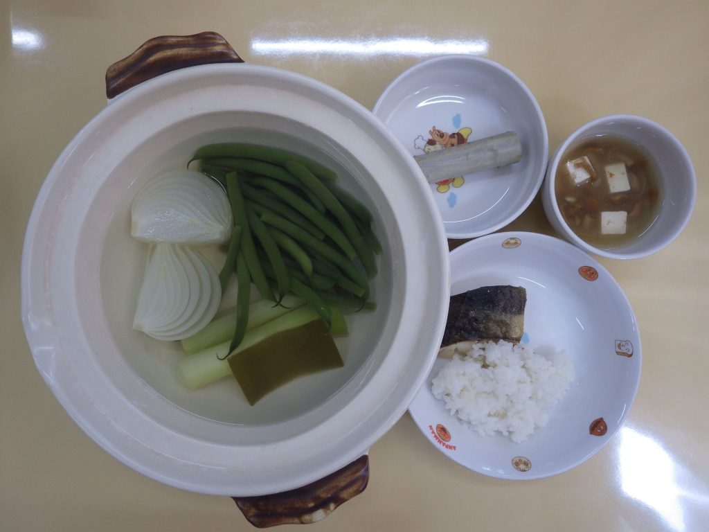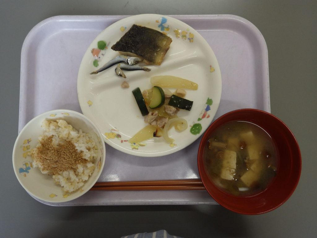 今日の給食 2024.08.27 今日の給食は ごはん(もも組、すずらん組白米、ひまわり組五分づき、以上児クラス玄米) ごはんにはすり胡麻をかけています。 味噌汁(豆腐、なめこ、ねぎ) ほっけ塩焼き 塩麹炒め(鶏肉、ズッキーニ、玉ねぎ) ひまわり組、以上児クラスは煮干しも食べています。 離乳食は ごはん(白米軟飯) 味噌汁(豆腐、なめこ、ねぎ) ほっけ焼き 土鍋野菜(玉ねぎ、インゲン、ねぎ) 咀嚼用ごぼう