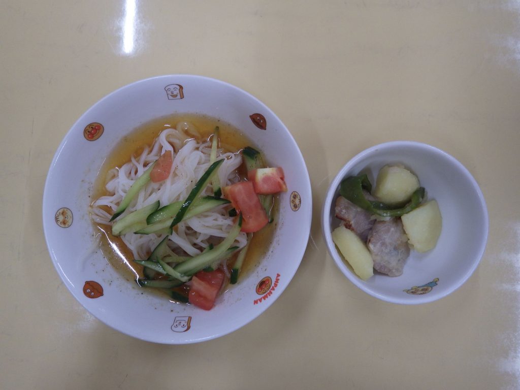 今日の給食 2024.09.13 今日の給食は 冷やし中華(ひまわり組、以上児クラスは中華麺、きゅうり、トマト) オーブン焼き(鶏肉、じゃがいも、ピーマン塩麹) ひまわり組、以上児クラスは煮干しも食べます。 もも組、すずらん組は米粉麺です。 そして、午後のおやつは 焼き蓮根です! 子どもたちはむしゃむしゃとい美味しそうに食べます!!