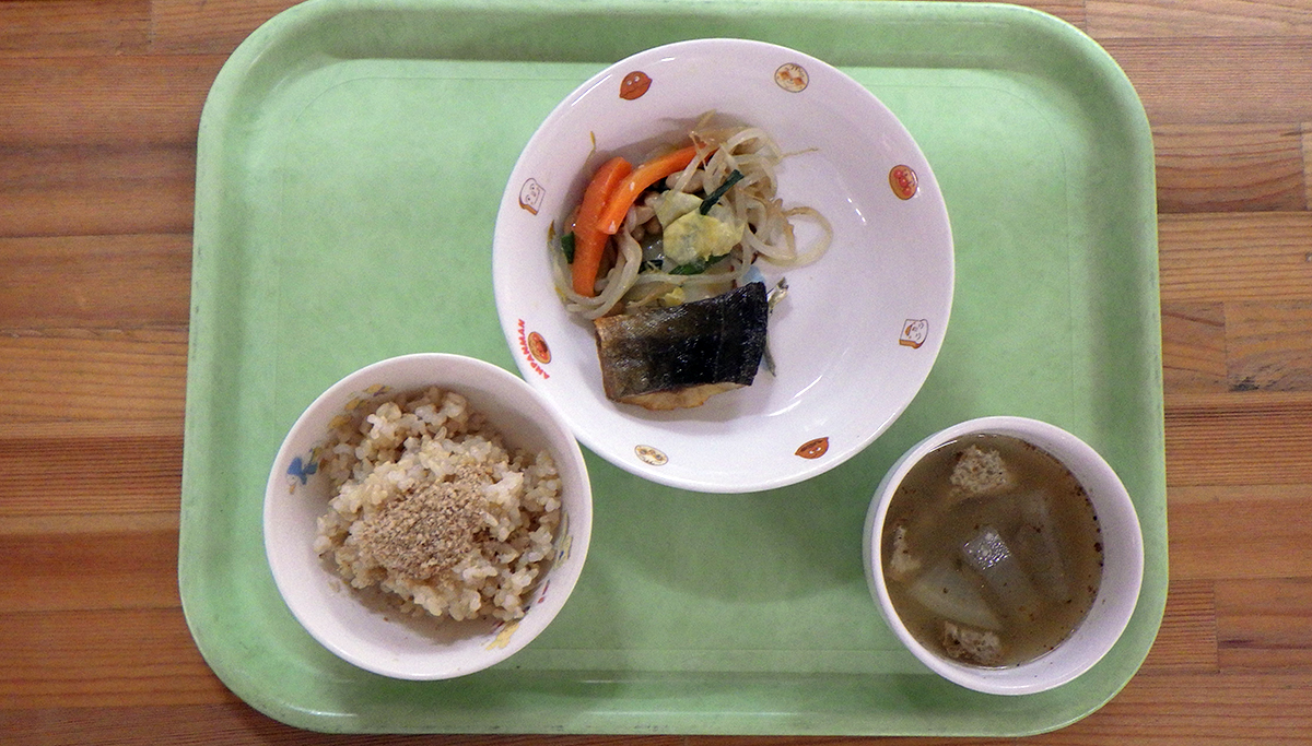 今日の給食 2024.04.02 こちらは3~5歳児の給食です。玄米ご飯と納豆と野菜炒め…。その前に煮干しをカジカジいっぱい噛みます。♪噛め噛め噛めよよく噛めよ♪ 噛むほど唾液がいっぱい出てるからね。毎日、煮干しを食べています! こちらは1~2歳児の給食です。 未満児クラスは0歳児、一歳児クラスは白米、二歳児クラスは五ぶつきを食べます。よく噛んで食べます。