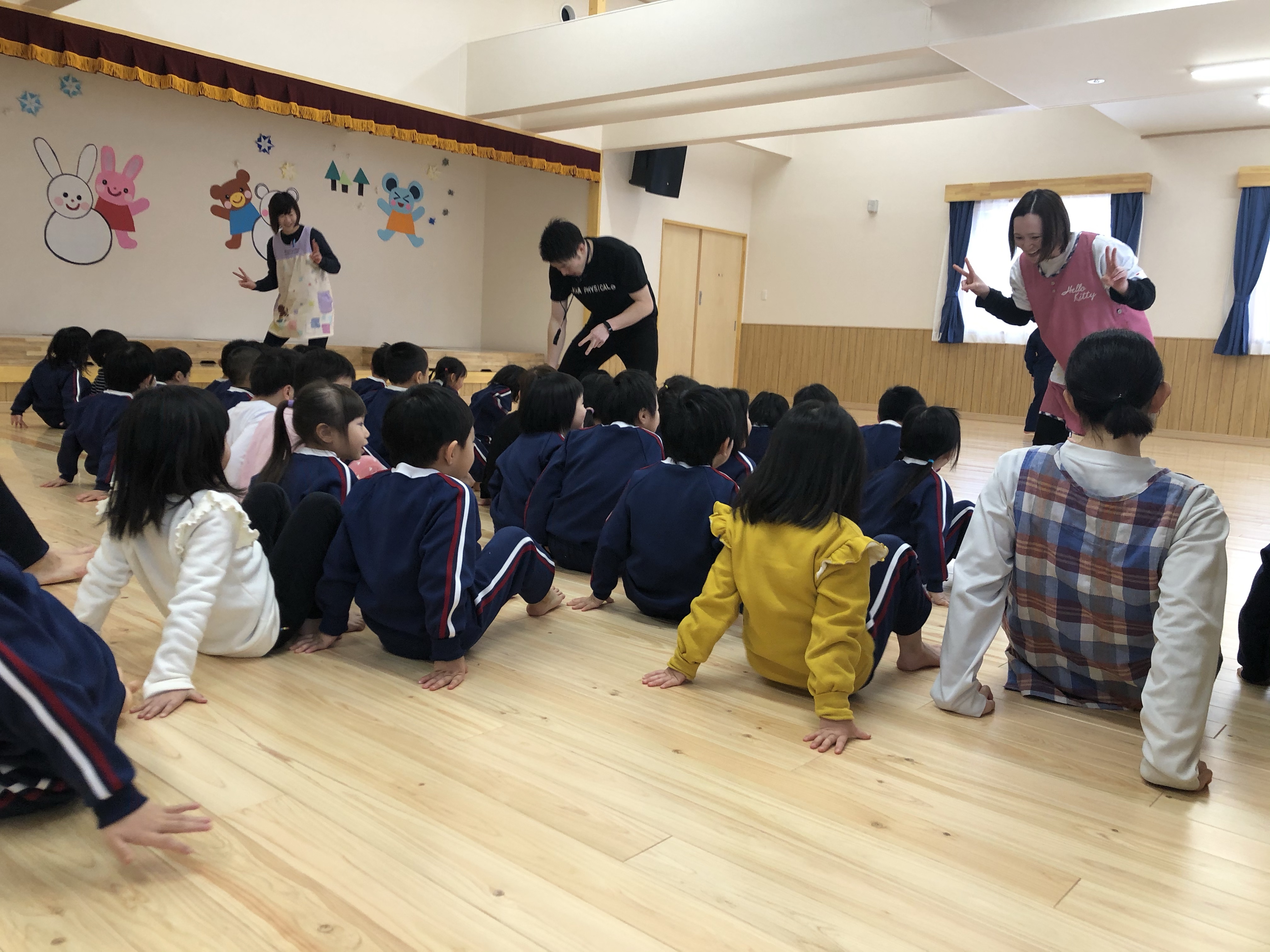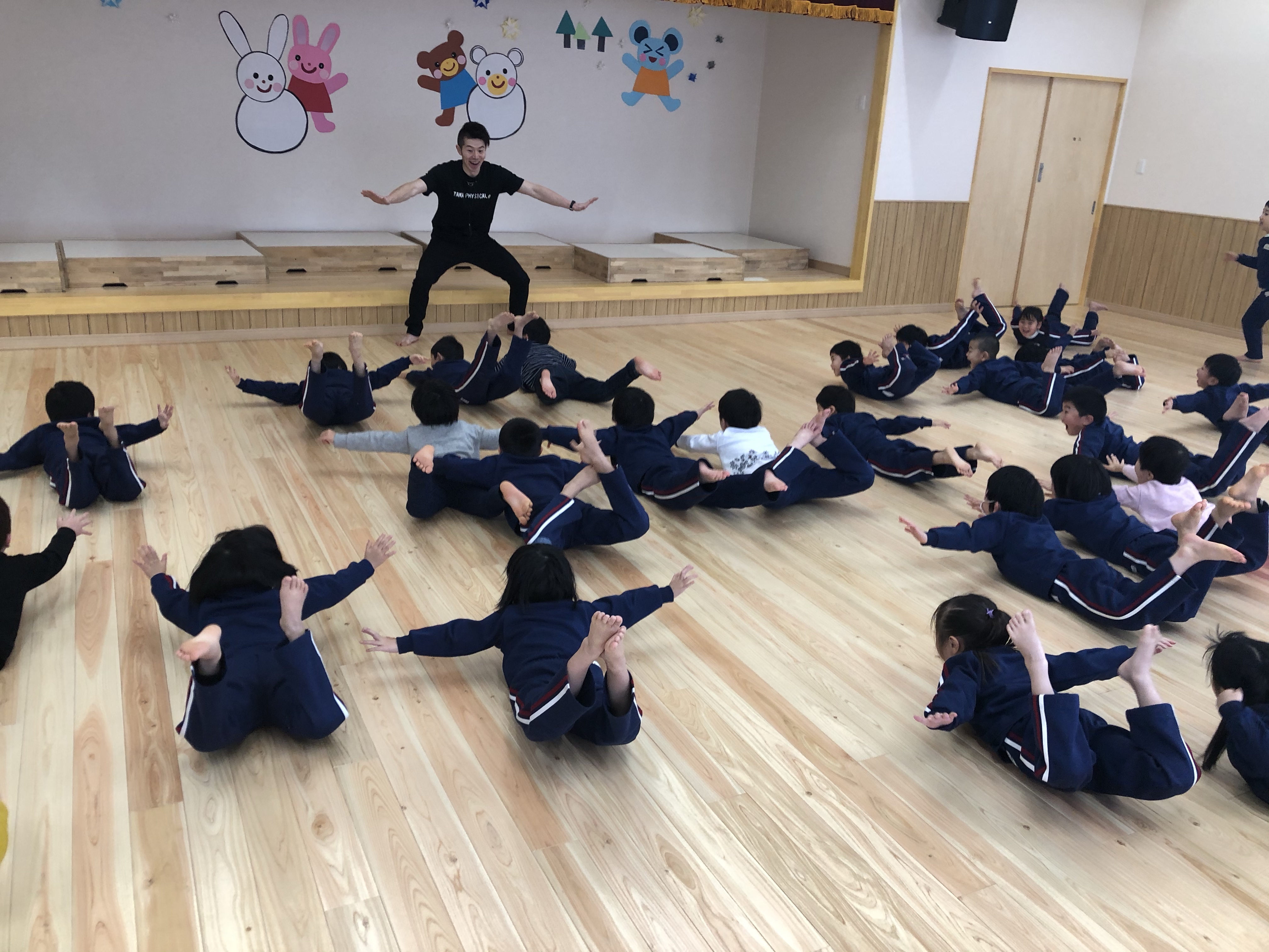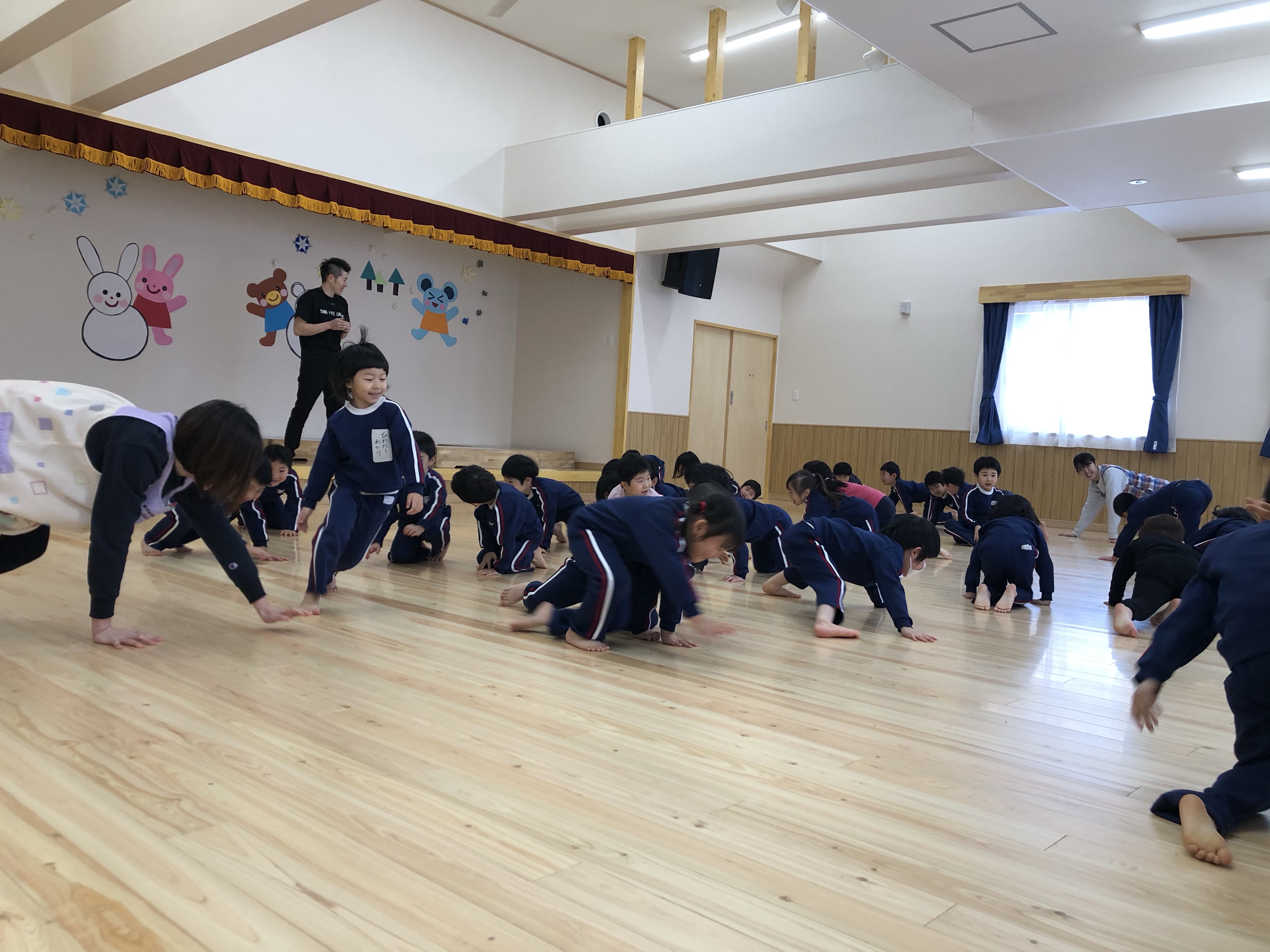 仲間と 2020.01.21 今日はゆり組さん、すみれ組さんの運動の日。 照井先生と楽しく身体を動かして遊びました。 バランス取るのも中々難しそう! カニの🦀照井先生に捕まらないように急いでお尻で逃げていました。