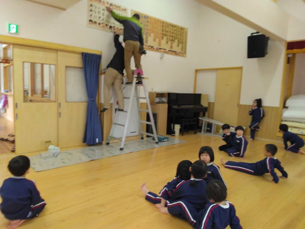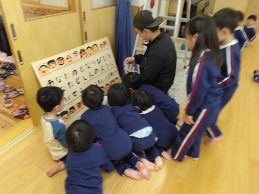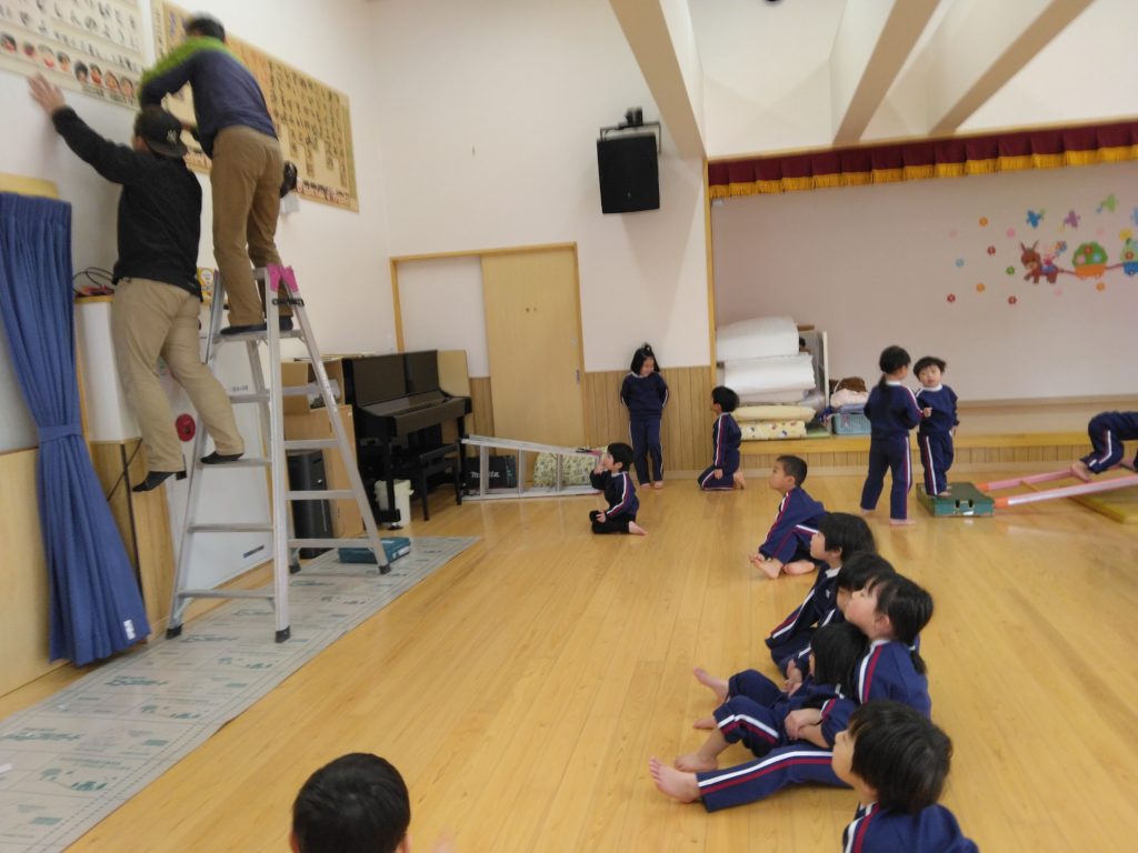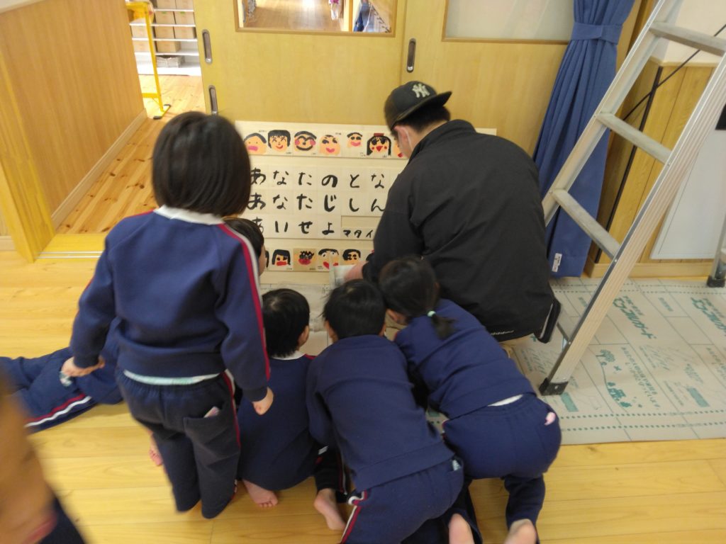 大工さんは二人、大きな板を持って遊戯室へ行くと、子どもたちが集まりました。「なにがはじまるの?」と、大工さん近づき動きを見ています。ついに子どもたちは大工さんを囲み出しました。