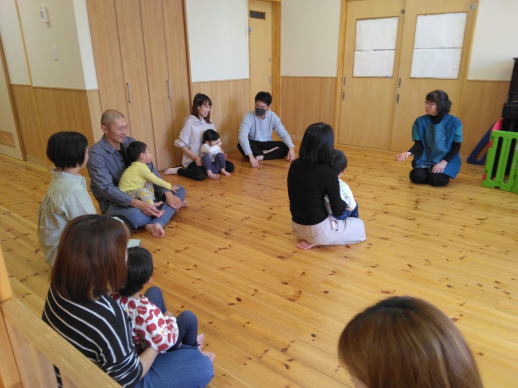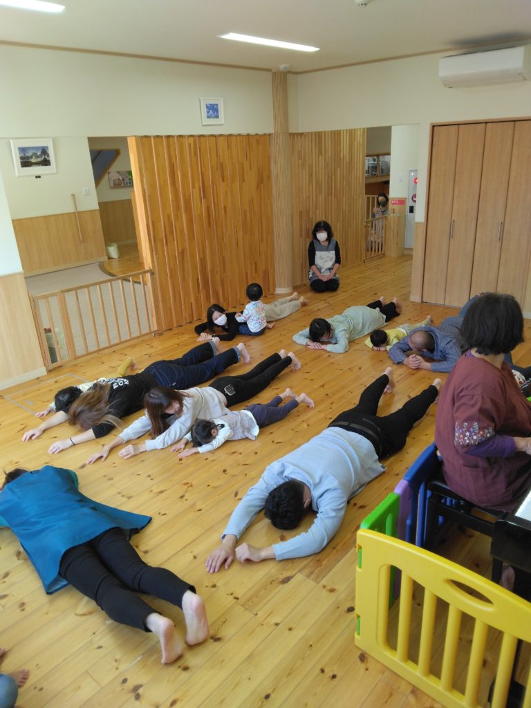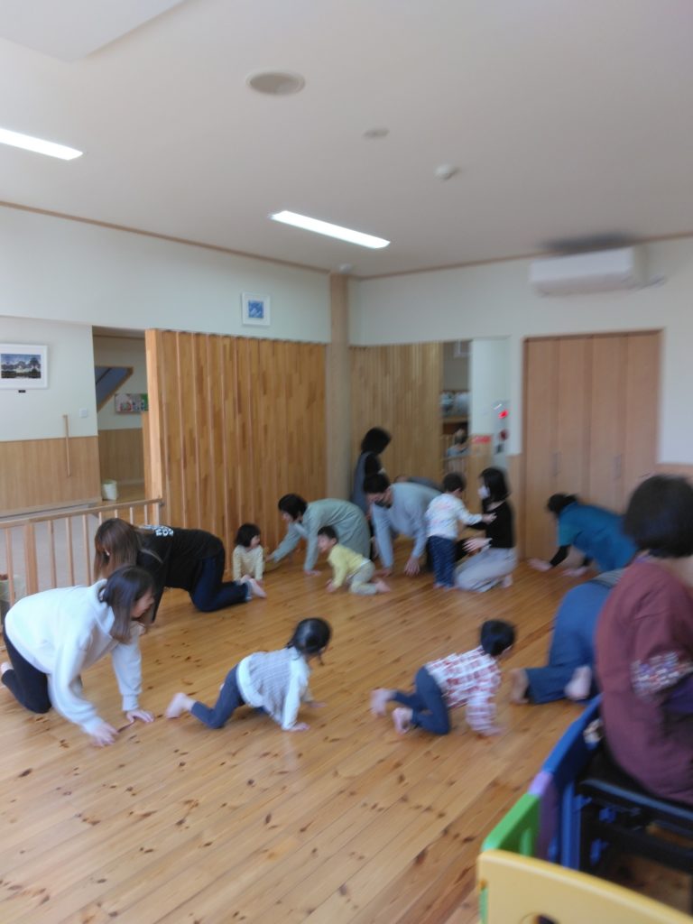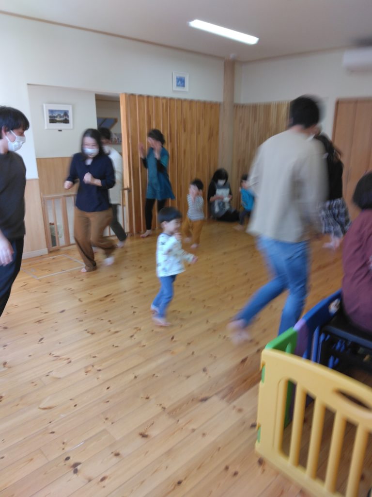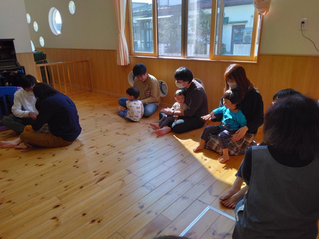 小ホールに移動していつものようにリズム遊びをお父さん、お母さんも一緒に楽しみましました。